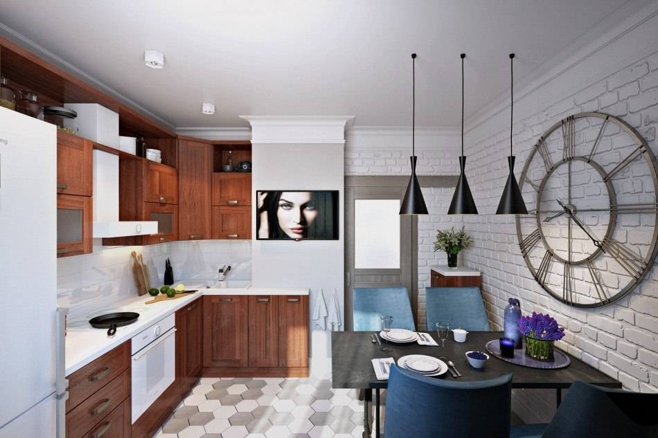 Укладка деревянного пола — весьма заманчивое и практичное решение. Осветленные или серые планки хорошо дополнят общее оформление. Выбирать для укладки следует террасную доску или ламинат наивысшего класса. Такие изделия максимально устойчивы к истиранию, обладают повышенной прочностью и надежностью. Декор из деревянных планок можно размещать и на стенах. К примеру, выделить ими можно центральную часть стенки возле обеденной группы. Такой прием подойдет для стилизации и обшивки оконного проема. Тон дерева должен соответствовать общей цветовой гамме, выбранной для отделки. Деревом можно горизонтально обшить 1/3 стенки над кирпичами (в зоне готовки или отдыха). Да и сам потолок (или его часть) могут обшиваться светло-коричневым, выбеленным деревом для создания уютной и комфортной атмосферы. Правда, обшивка из дерева несколько «съест» высоту стен. Такой вариант лучше использовать для помещений с высокими потолками.