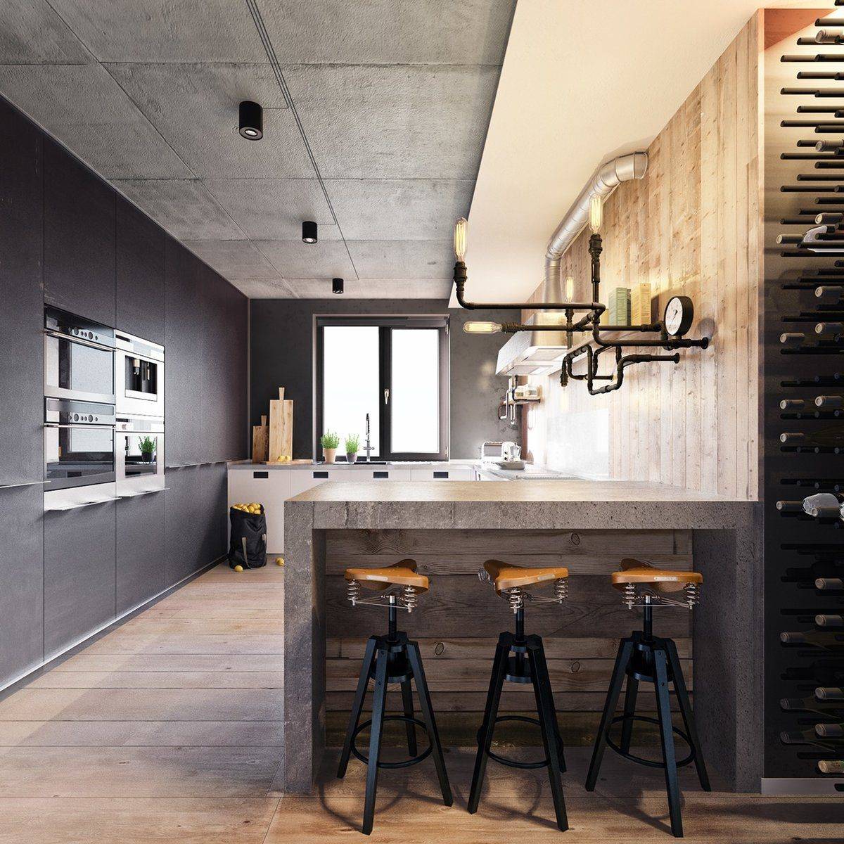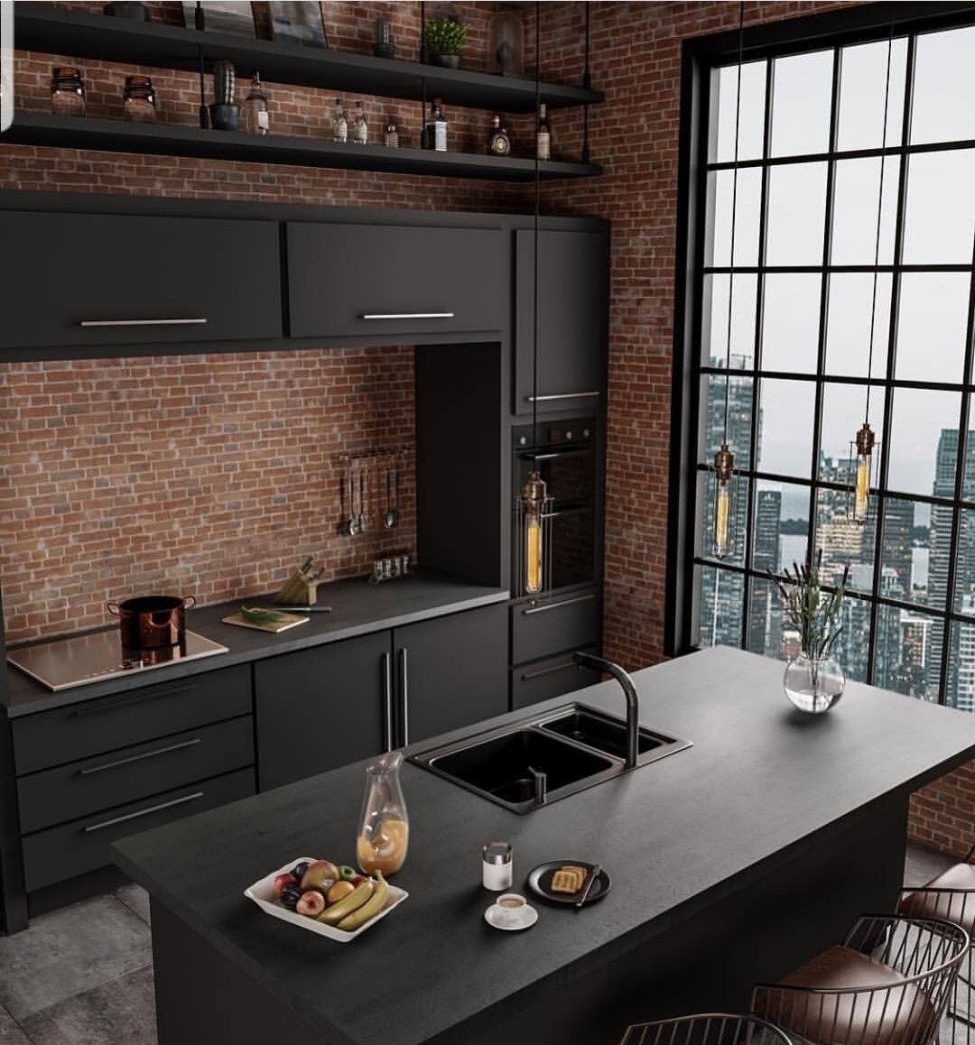 Лучший момент, чтобы сделать лофт в вашей кухне более тёмным. Чёрные трековые светильники, барные стулья, шторы.