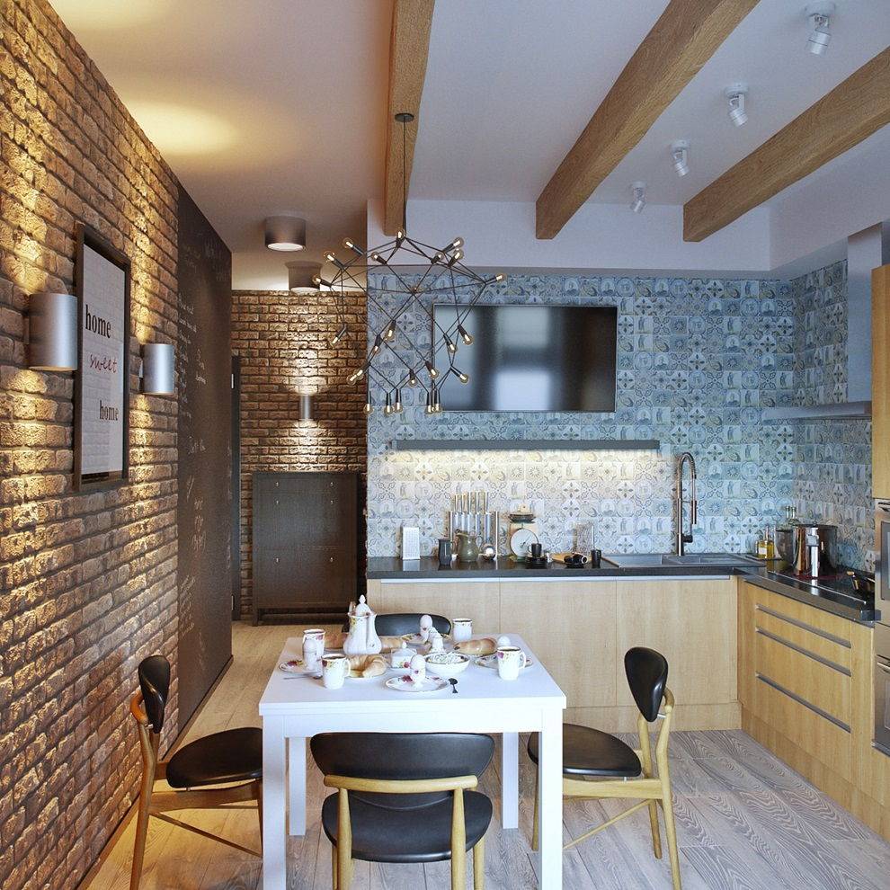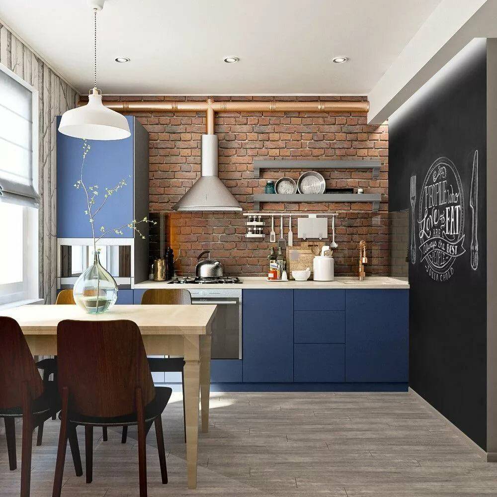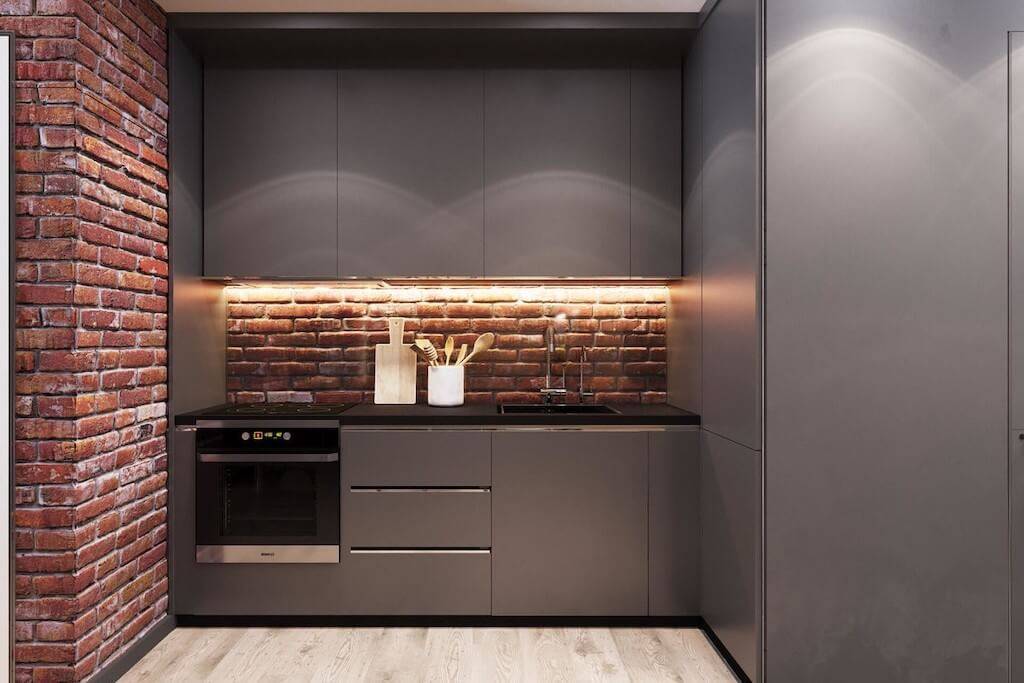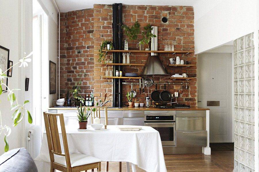 Кирпичная стена – фирменный знак этого стиля. Но в дозированных количествах, особенно для маленьких помещений. Использовать этот материал для кухонного фартука не слишком практичная идея, так как отмыть его будет весьма проблематично. Для этих целей лучше подойдет настенная плитка.