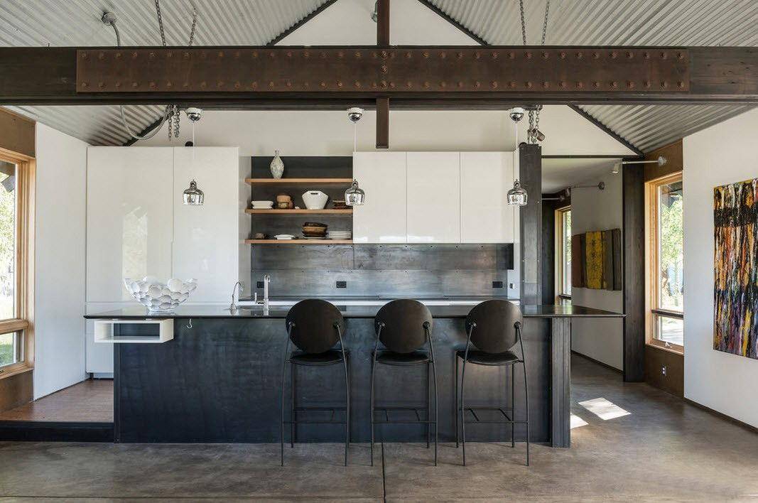 - Идеальным дополнением интерьера станут металлические или деревянные балки по периметру потолка, окрашенные в черный или серебристый цвет. Делать балки или устанавливать вентиляционные трубы, которые впоследствии могут использоваться для размещения источников освещения, желательно при наличии высоких потолков.