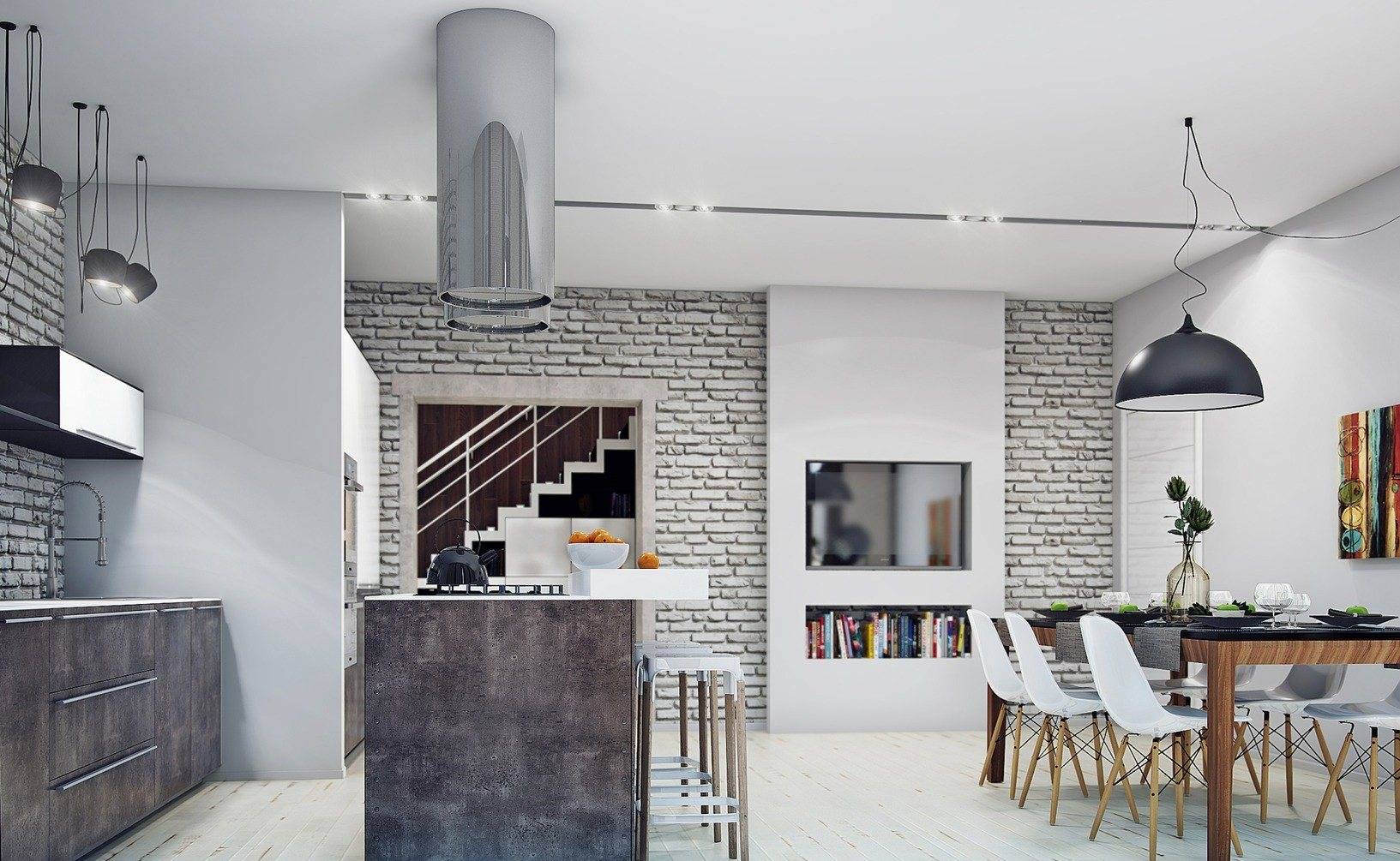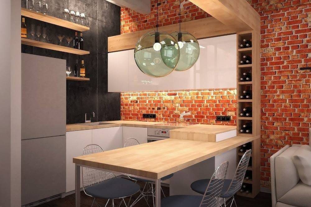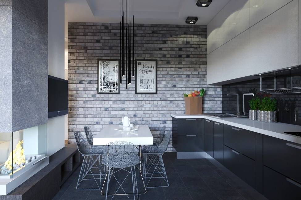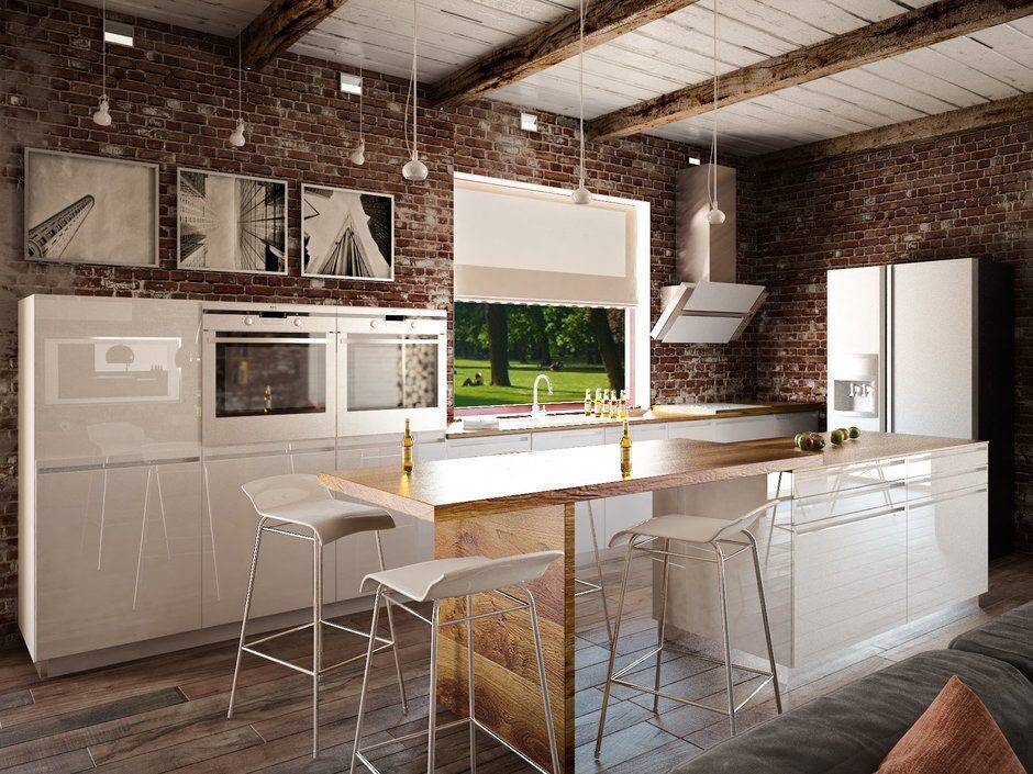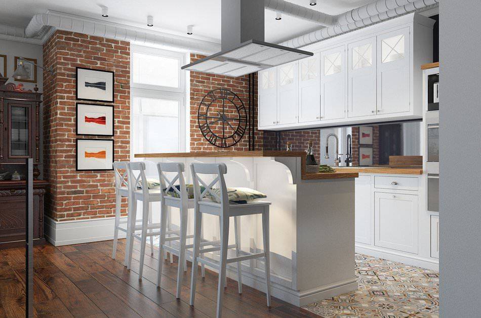 Белый кирпич для кухни в стиле лофт в квартире подходит лучше и вписать его проще. Уже можно имитировать декоративным камнем или гипсовой штукатуркой. Желательно подсвечивать.
