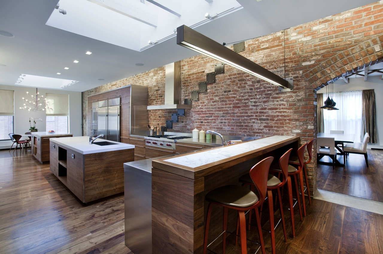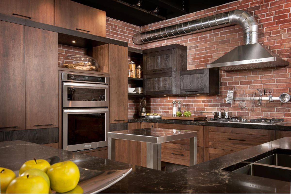 Самый жесткий вариант стиля лофт для кухни — красная кирпичная кладка. Вписать в интерьер красный кирпич сложно. Имитировать его декоративным камнем — плохая идея почти всегда.