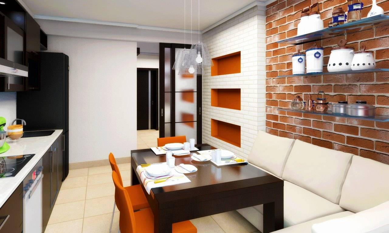 К примеру, для стилизации кухоньки в хрущевке. Лучшим вариантом станет использование в качестве основы светло-желтого колера. В качестве дополнительных цветов подойдут красно-оранжевый, кирпичный, коричнево-красный. Красиво смотрится сочетание светло-желтого с розово-коричневыми вкраплениями. Можно остановить выбор и на белой отделке. В таком случае вкрапления могут быть кирпичного, серого и даже черного цвета.