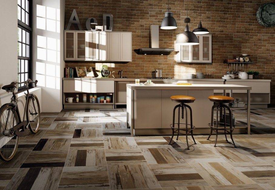 Для покрытия пола употребляются разные материалы, с помощью которых дополнительно зонируют пространство. Однако следует учесть, что невыгодно выполнять ламинатом или паркетной доской рабочую область, потому что их защитный слой подвергается механическому воздействию: быстро стирается, на нем появляются царапины. Идеальной комбинацией считается совмещение качественной плитки в рабочей зоне и дерева в обеденном пространстве.