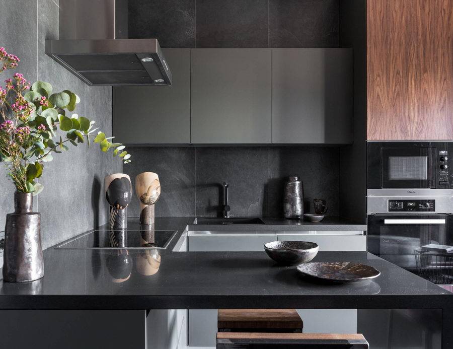 Наиболее «свой» цвет здесь это серый, который присутствует почти везде – от стен до техники. Вложитесь в этот цвет для основного оборудования, гарнитура, мебели. Он не надоест и будет хорошей базой для того, чтобы менять мелкие акцентные детали, которые можно подобрать более яркого цвета. Эта хитрость придумана, чтобы освежать декор, который может надоесть с течением времени и довольно легко менять незначительные детали, получая визуальное и практическое обновление.