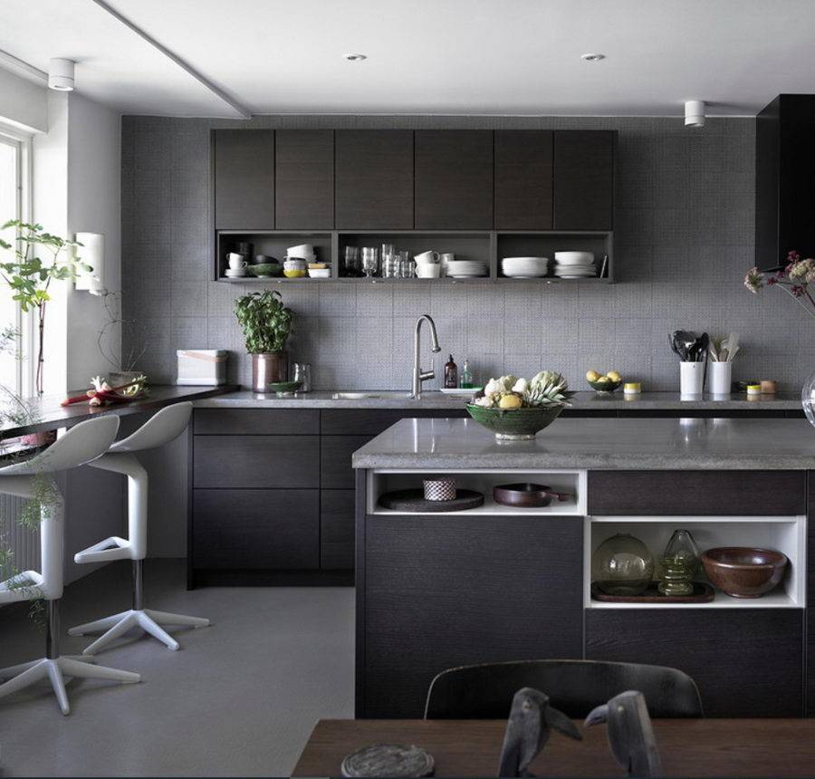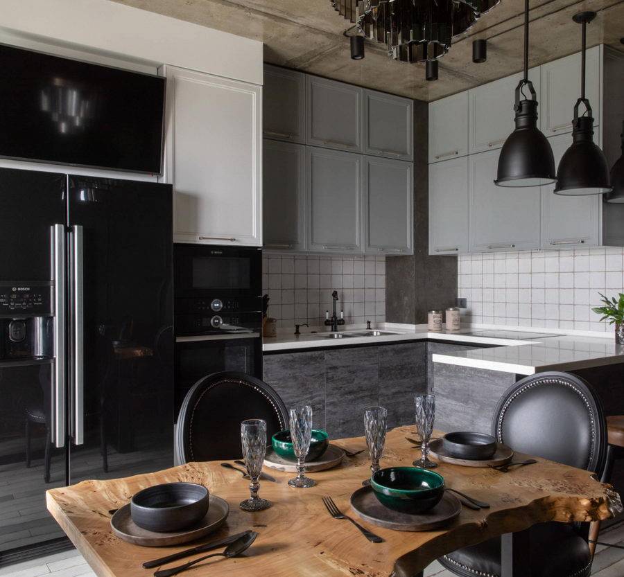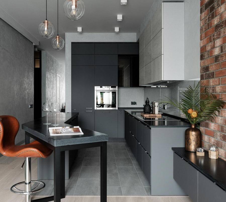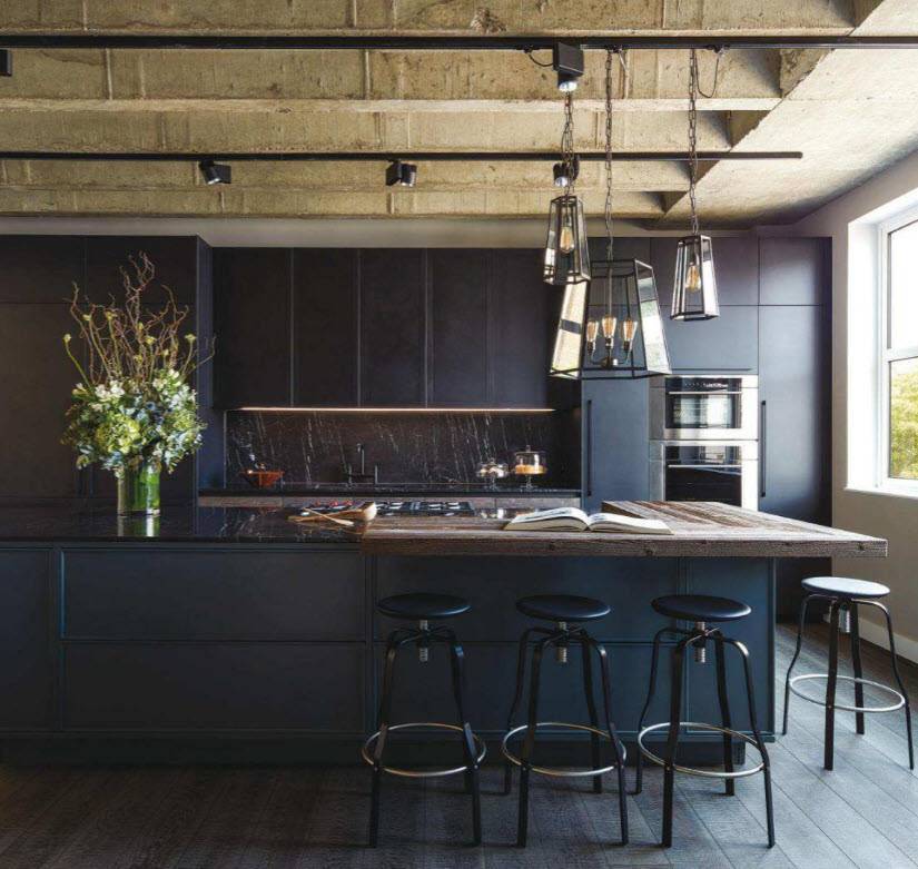 Черный цвет. Многим такая кухня может показаться темной и неуютной, но это не так. Темные тона создают нужное настроение брутальности, подчеркивающее грубость этого стиля. Черный цвет можно отобразить в глянцевых фасадах мебели и угольном напольном покрытии. Стоит помнить, что такое цветовое решение допустимо только в просторных кухнях.