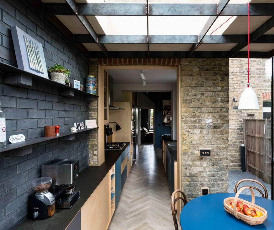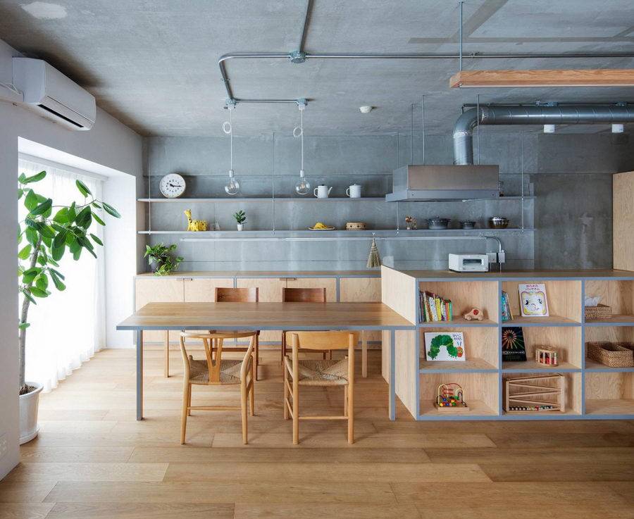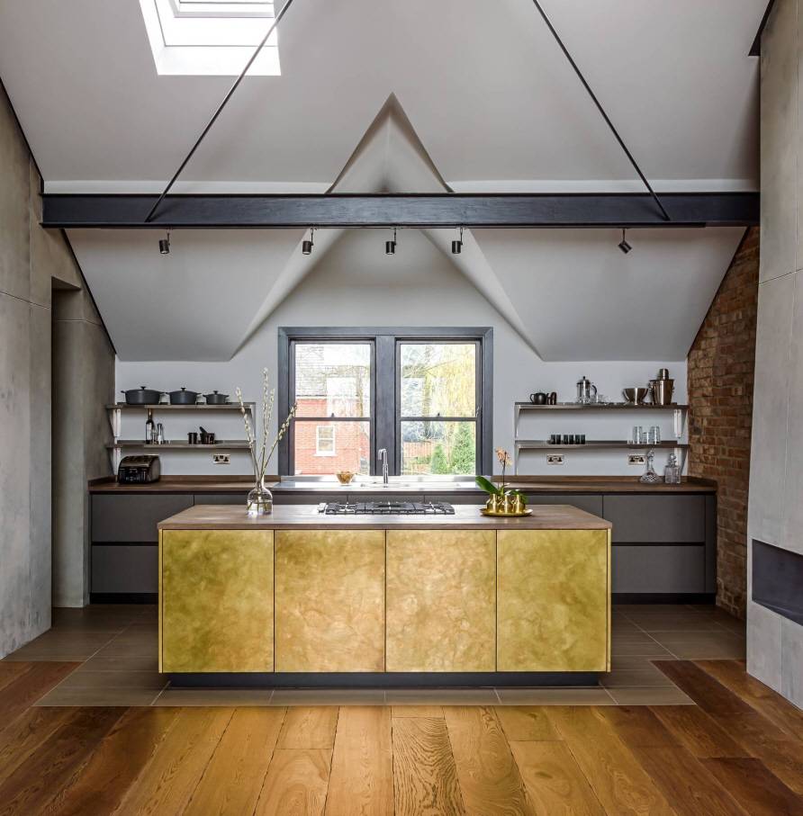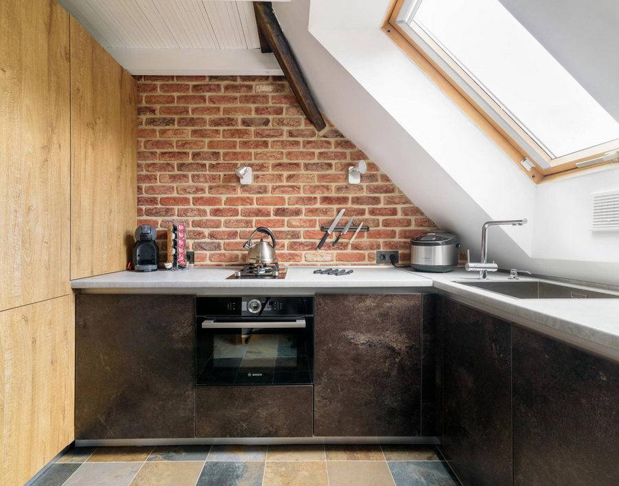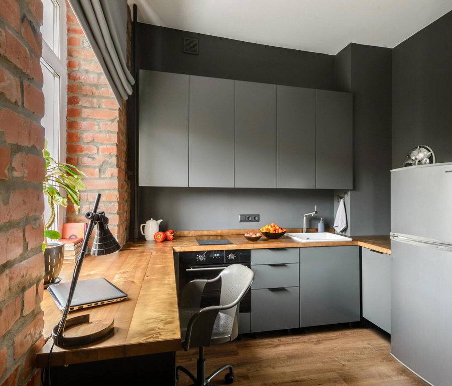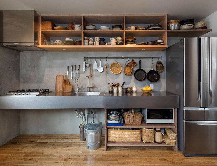 В данном случае можно отойти от стандартных решений. Есть возможность, например, полностью отказаться от навесных кухонных шкафов и антресолей и организовать пространство с помощью грубых открытых полок и консолей.