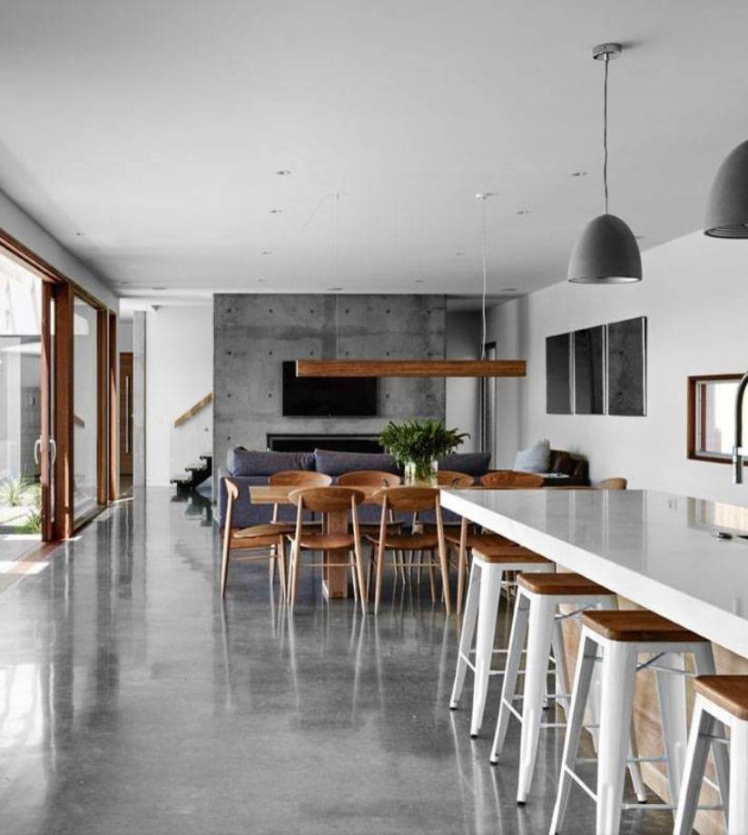 Для покрытия пола употребляются разные материалы, с помощью которых дополнительно зонируют пространство. Однако следует учесть, что невыгодно выполнять ламинатом или паркетной доской рабочую область, потому что их защитный слой подвергается механическому воздействию: быстро стирается, на нем появляются царапины. Идеальной комбинацией считается совмещение качественной плитки в рабочей зоне и дерева в обеденном пространстве.