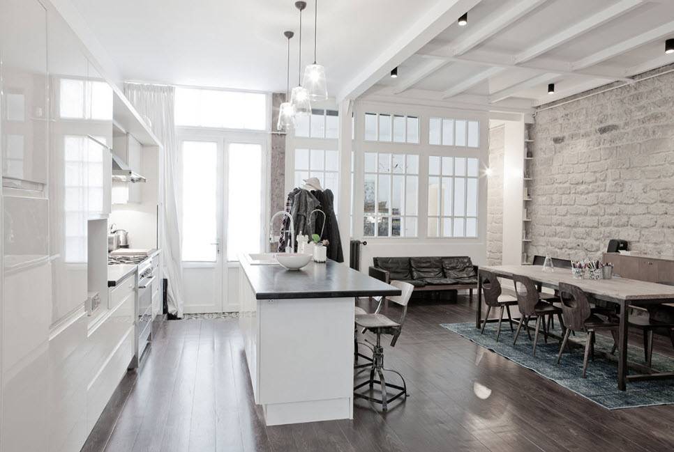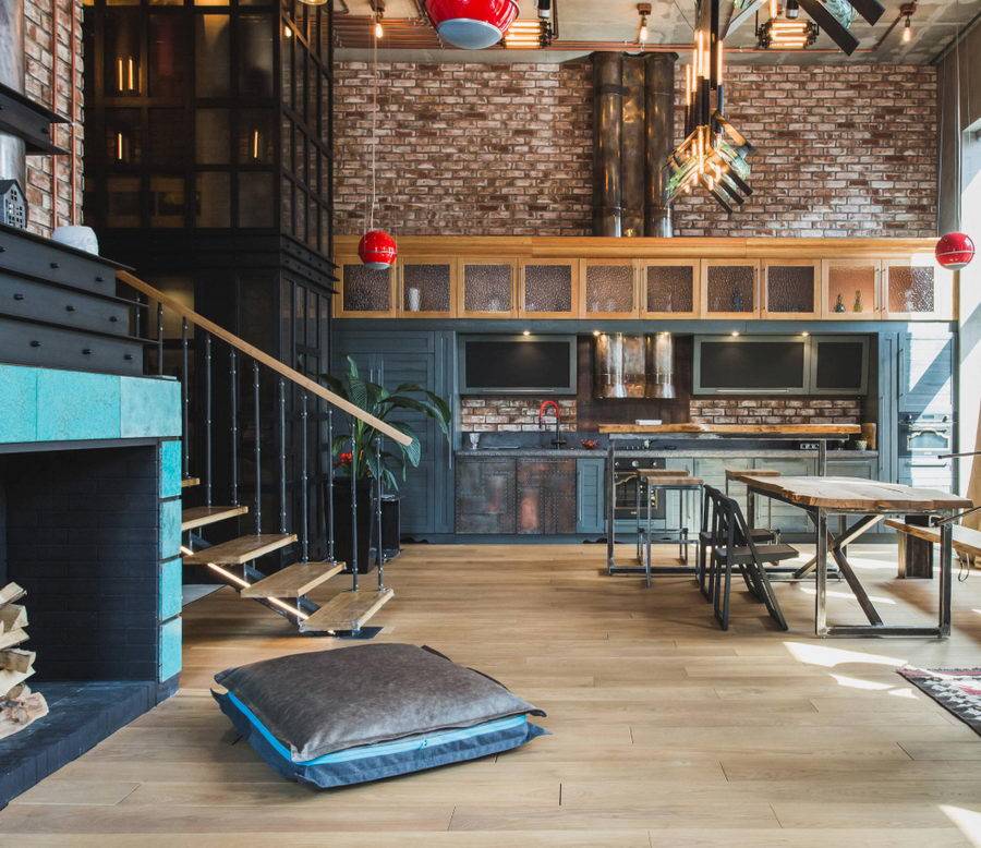 - сочетание современных материалов и отреставрированных деревянных полов, голых стен, выполненных из кирпича или задекорированных штукатуркой;