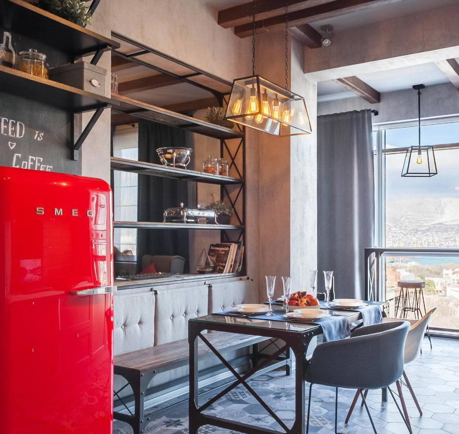 Главной изюминкой и ярким акцентом на кухне выступают ретро-холодильники красного цвета с закругленными углами, а также стилизованные плиты. Для создания спокойного лофтового дизайна в устанавливают более современное изделие со стальными дверцами.