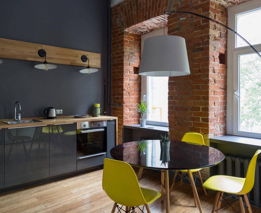 Коричневый цвет – классическое решение для стиля лофт. Цвет можно отобразить, как в массивной деревянной мебели, так и напольном покрытии (ламинат или паркетная доска). Конечно, отдельного внимания заслуживают фасады кухонного гарнитура и кирпичная стена, которая имеет насыщенный и весьма привлекательный оттенок.