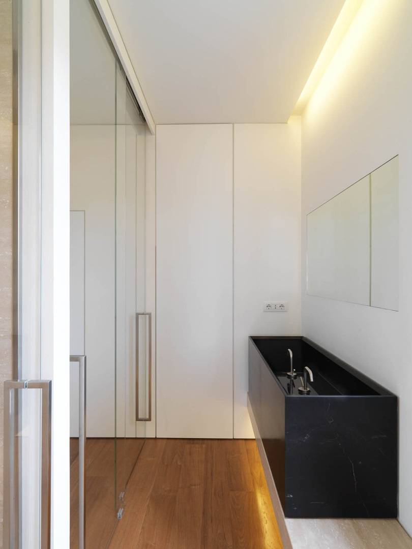 Поскольку в ванной комнате хранятся много мелких вещиц, решающее значение в планировании снова играют различные встроенные ящики, спрятанные от глаз полки и корзинки.