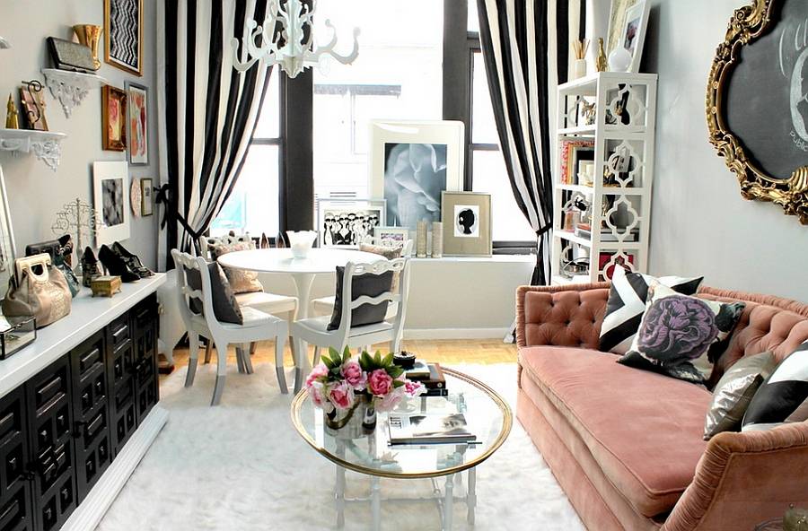 Гостиная в чёрно-белых с акцентами розового тонах.(Дизайн: Nichole Loiacono)