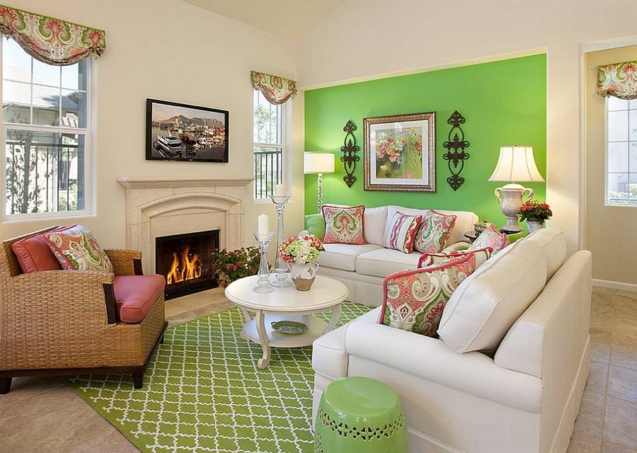 Смелый всплеск зеленых тонов в гостиной.(Дизайн: Borden Interiors & Associates)