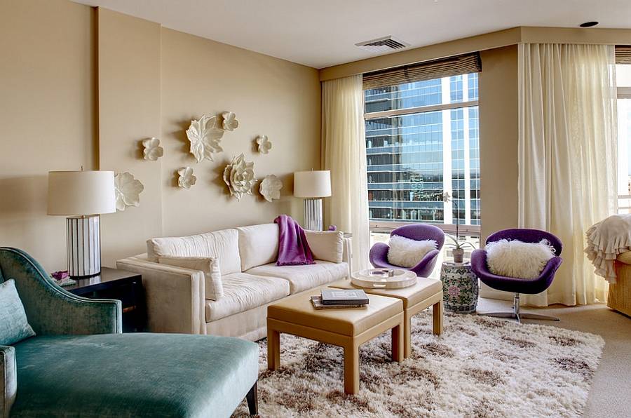 Живая растительность, акриловые журнальные столики, отделки из зеркальных поверхностей и красочные абажуры также добавляют ощущение того, что данная комната принадлежит очаровательной представительнице слабого пола.