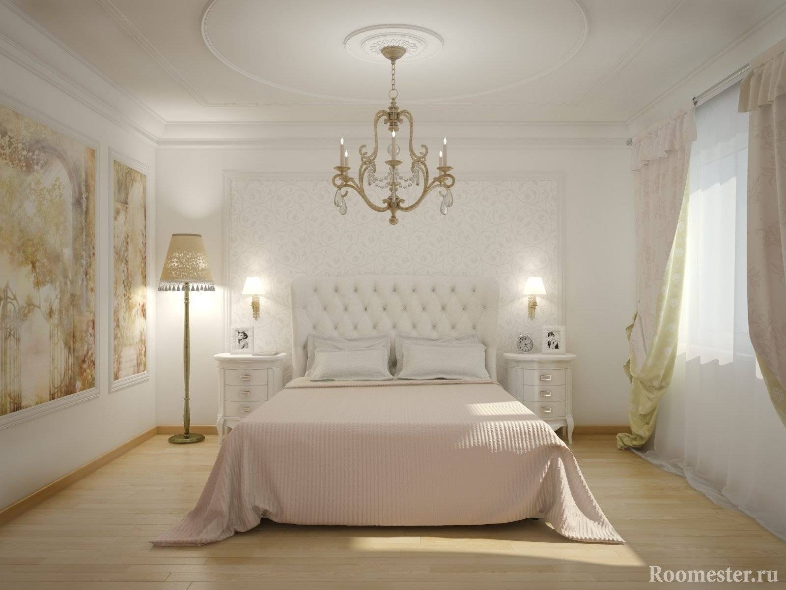 Следующий пример показывает, как можно обустроить квартиру в классическом стиле. Если использовать очень светлую цветовую гамму, белую мебель и легкие прозрачные занавески на окнах, то вполне можно использовать характерные классические элементы, такие как лепнина, драпировка, рюши и резьба по дереву.