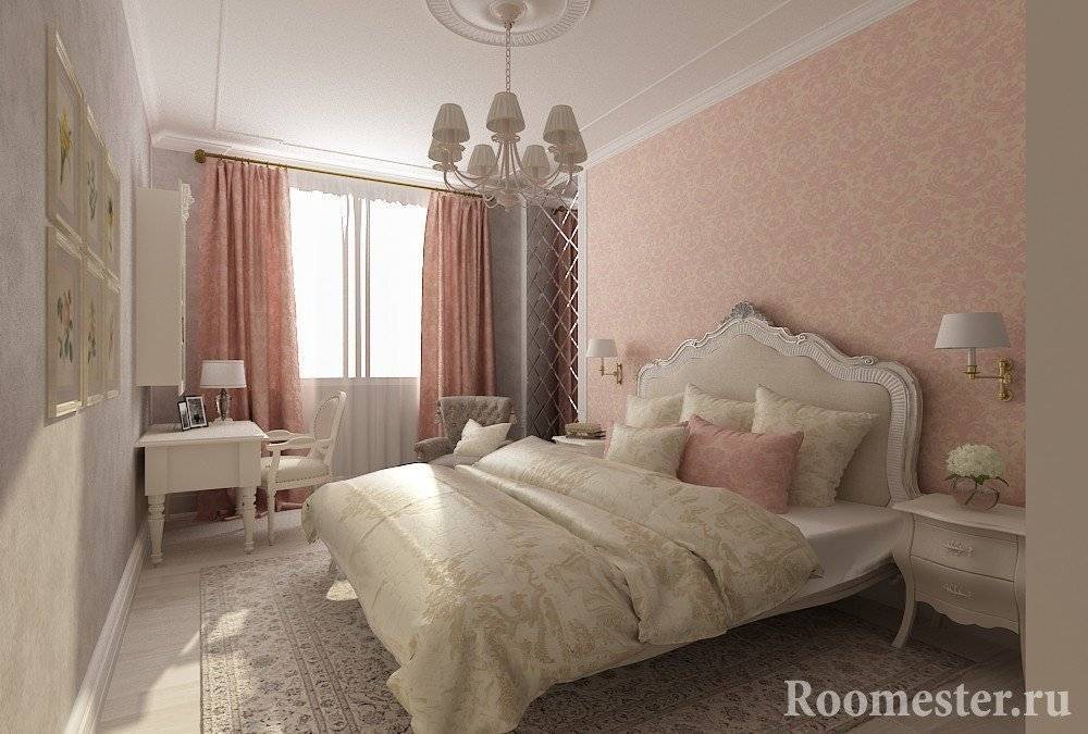 Следующий дизайн оформлен в легком романтичном стиле. Зона кухни выделена за счет использования фактурных материалов отделки: кирпичной кладки и напольной плитки под камень. Дополняют дизайн стулья в стиле прованс, зеркала в стиле шебби шик, приглушенный розовый цвет обивки дивана и пледа на кровати. Дизайн можно дополнить цветными шторами в тон текстилю, а также несколькими картинами в деревянных или позолоченных рамах, как зеркало.