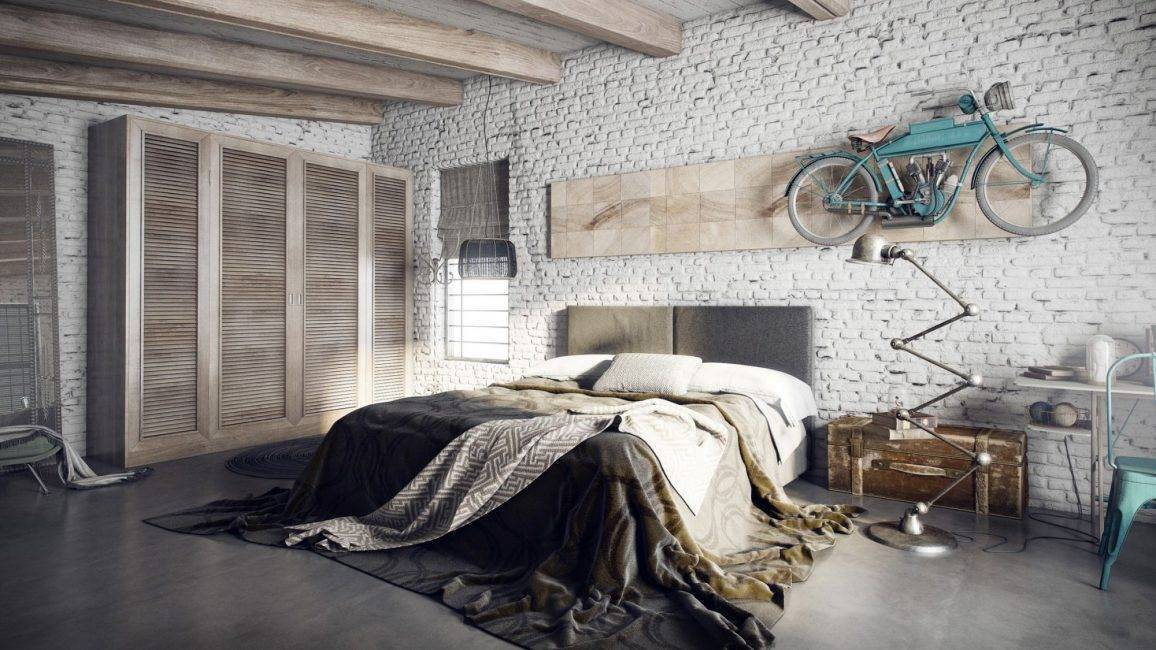 Стены в спальне с интерьером modern loft должны быть неровные и покрытые белой краской. Это визуально расширит пространство и сделает ее светлее.