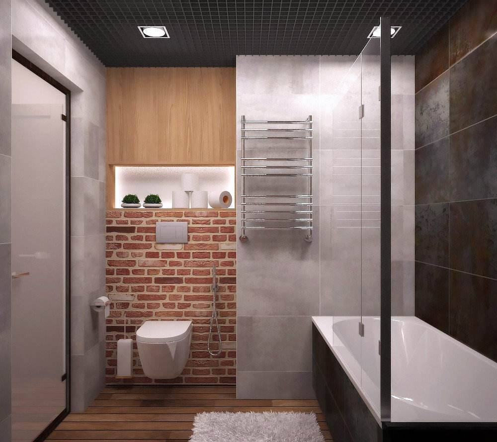 Ванная и туалет отделываются кафельной плиткой. Цвет может быть однотонный или с имитацией камня, дерева и кирпича. Для отделки потолка практичнее использовать металлические панели с точечными светильниками.
