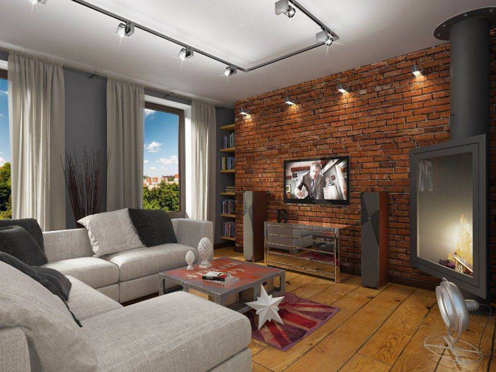 Интерьер гостиной с высокими потолками украсит конструкция из вентиляционных труб или потолочных балок. Стены могут быть отделаны кирпичной кладкой, деревянными панелями или грубо оштукатурены. Напольное покрытие выполняют из ламината или техникой наливного пола. Натуральный бетонный пол покрывают небольшим ковром с коротким ворсом.