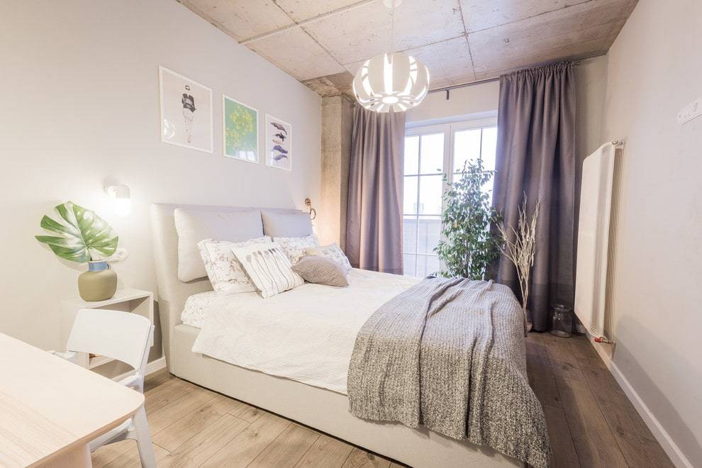 Оригинальной идеей в оформлении маленькой спальни и комнаты для молодой девушки может стать сочетание грубых фактур и мягких акцентов. Высокий бетонный потолок слегка отшлифован и покрыт бесцветным лаком. Он не давит благодаря светлой отделке стен и свету, падающему из большого арочного окна. Тень из окна зрительно вытягивает пространство по вертикали. Грубые фактуры, характерные для данного стиля, смягчили текстильной обивкой дивана, яркими декоративными подушками и белым пушистым пледом из искусственного меха. Ярким акцентом является островок зелени из живых растений в керамических горшках, расположенный на полу вдоль большого окна.