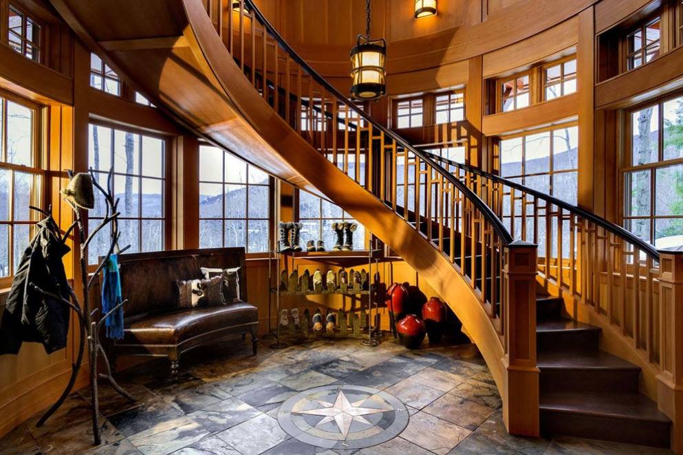 Спиральная лестница имеет особый шарм, лучше всего сочетать с такими стилями, как ампир, модерн или рококо. Перила изготавливаются на вкус хозяина, раньше использовались ажурные, однако они хоть и выглядят как из сказки, но не имеют особой популярности в наше время. Винтовой вариант лестницы считается опасным для детей и пенсионеров, так как край лестницы очень узкий и есть риск получения травм. В центре лестницы располагается опора, представляющая собой трубу из дерева или металла, а достоинство заключается в том, что установленная лестница занимает минимум пространства.
