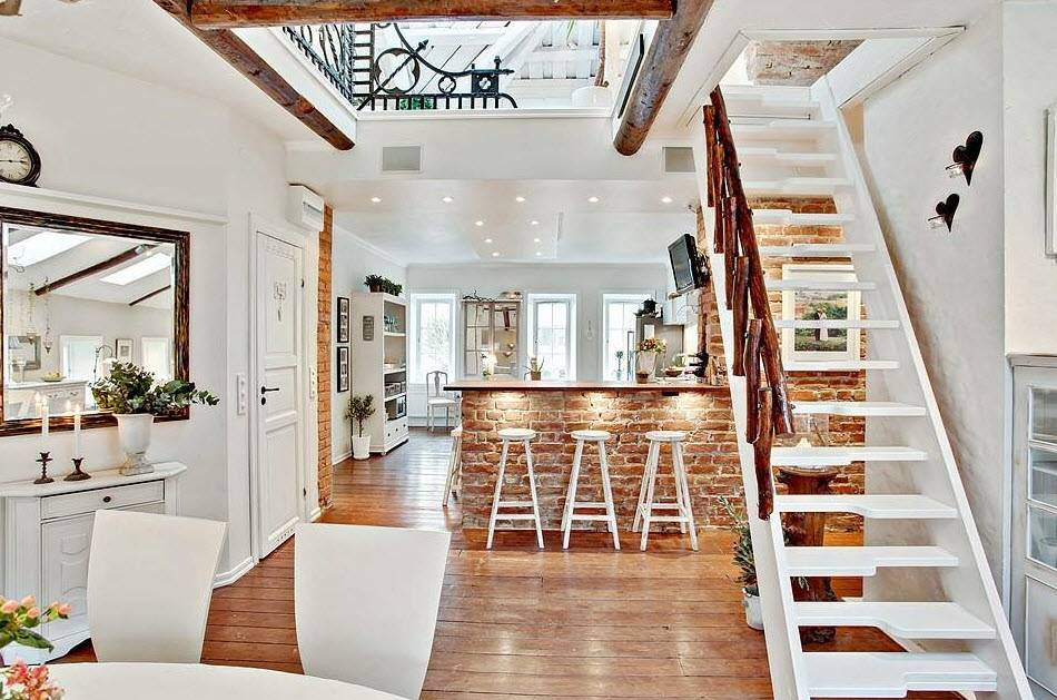 Данный стиль также приветствуется, ведь природное сырье и натуральная цветовая палитра, позволяют стать частью природы, почувствовав гармонию внутри дома. Конечно, в классическом варианте для отделки используют древесину. Альтернативный вариант – альпийский шале, который приветствует не только массивные деревянные доски красного или темно-коричневого цвета, но и камень. Также отделку можно провести ламинатом и паркетом, светлой керамической плиткой с матовой поверхностью.
