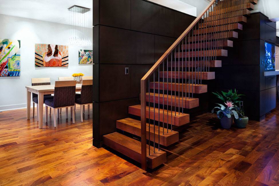 - Консольный лестничный пролет имеют ступени, поддерживаемые скрытым стрингером в стене и выглядят, будто плавают в воздухе, чтобы создать легкий, открытый вид.