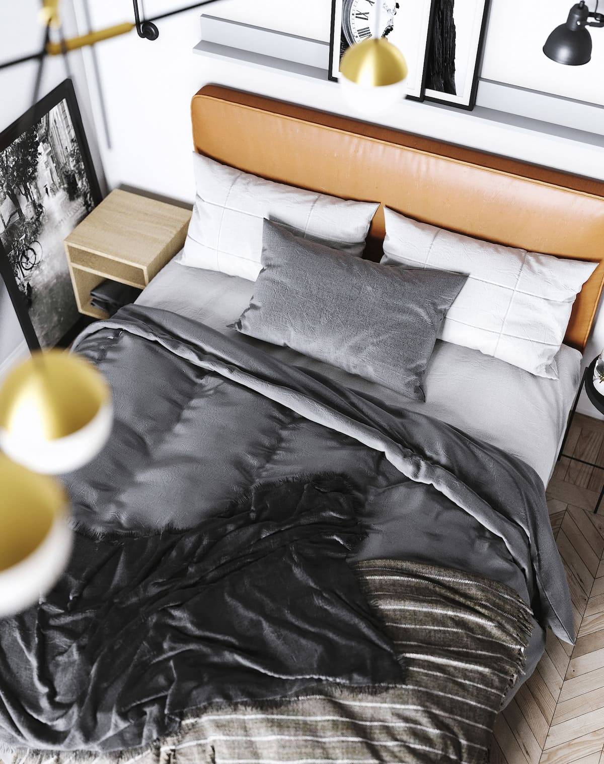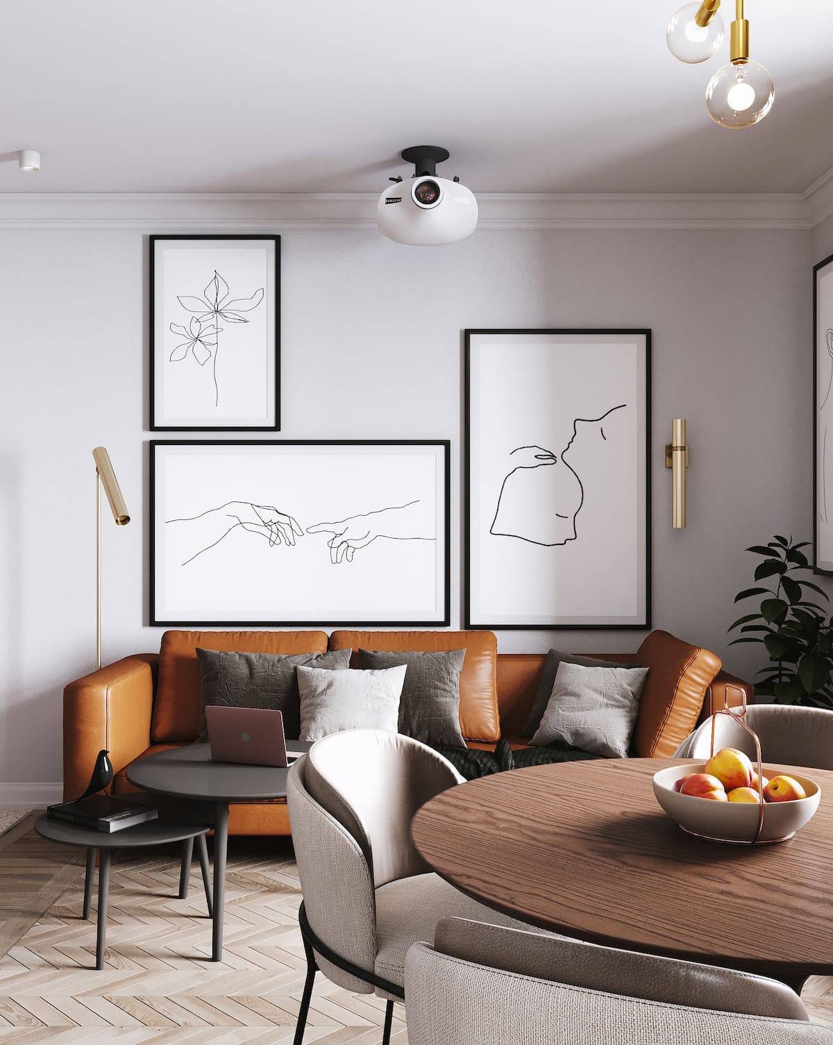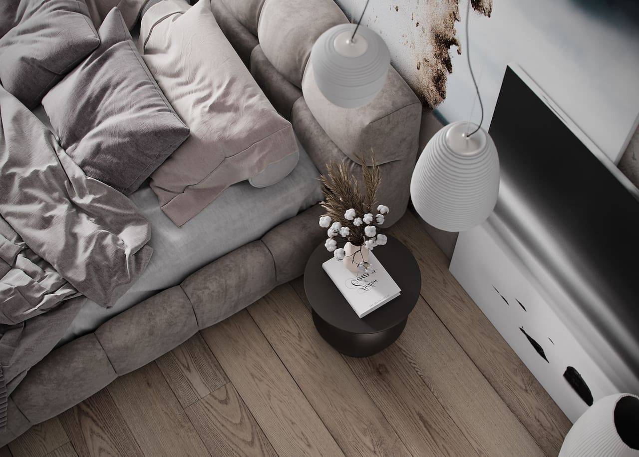 Ели вы оформили потолок и стены в белых тонах, выбирайте темные напольные покрытия. Такое сочетание визуально увеличит границы небольшой комнаты, и она не будет казаться загруженной. Чтобы нейтральные оттенки мебели не делали интерьер скучным, воспользуйтесь акцентами.
