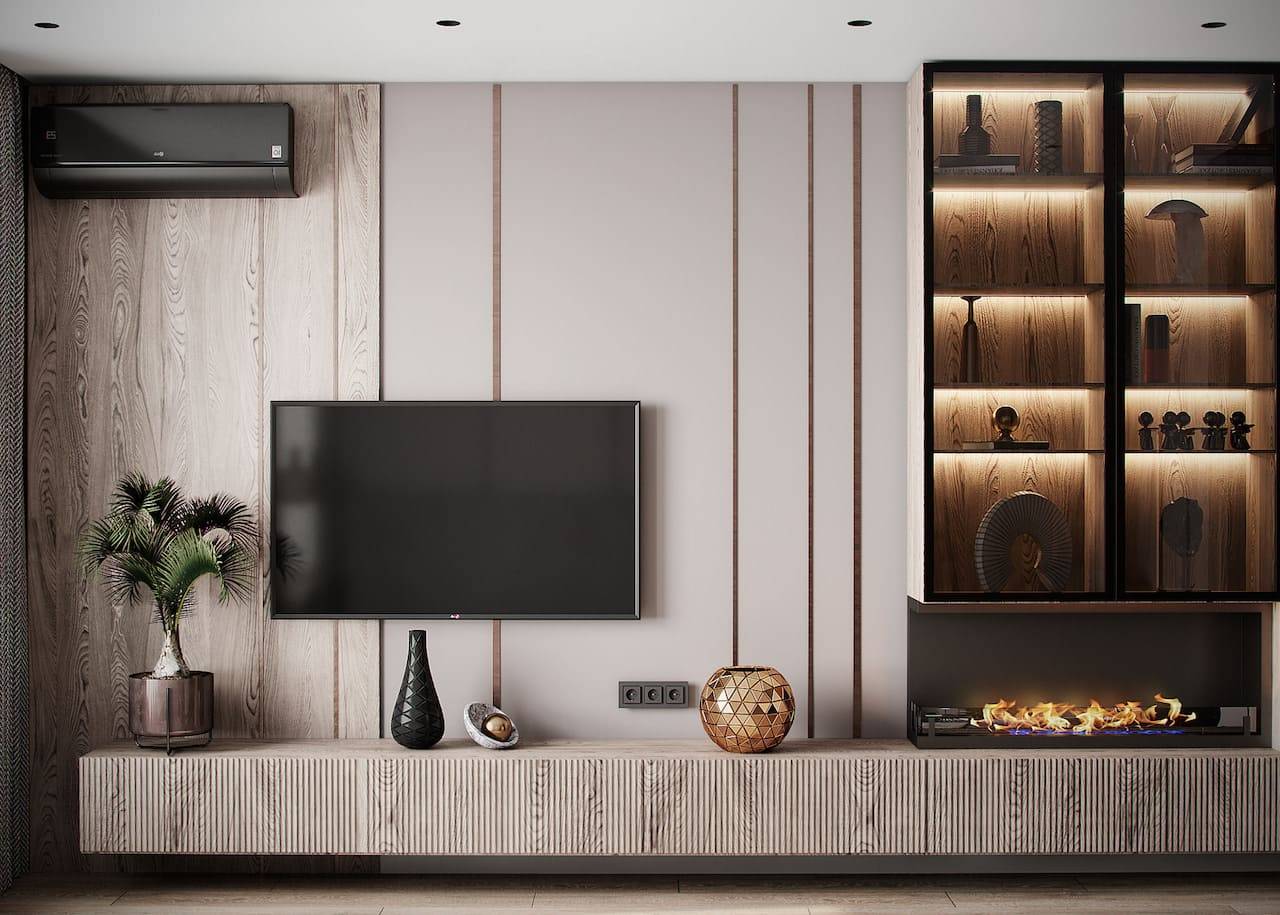 Чаще всего камин устанавливается недалеко от стены с телевизором.