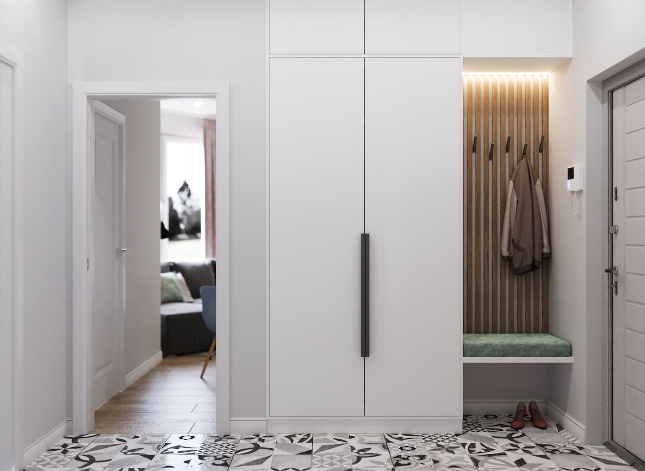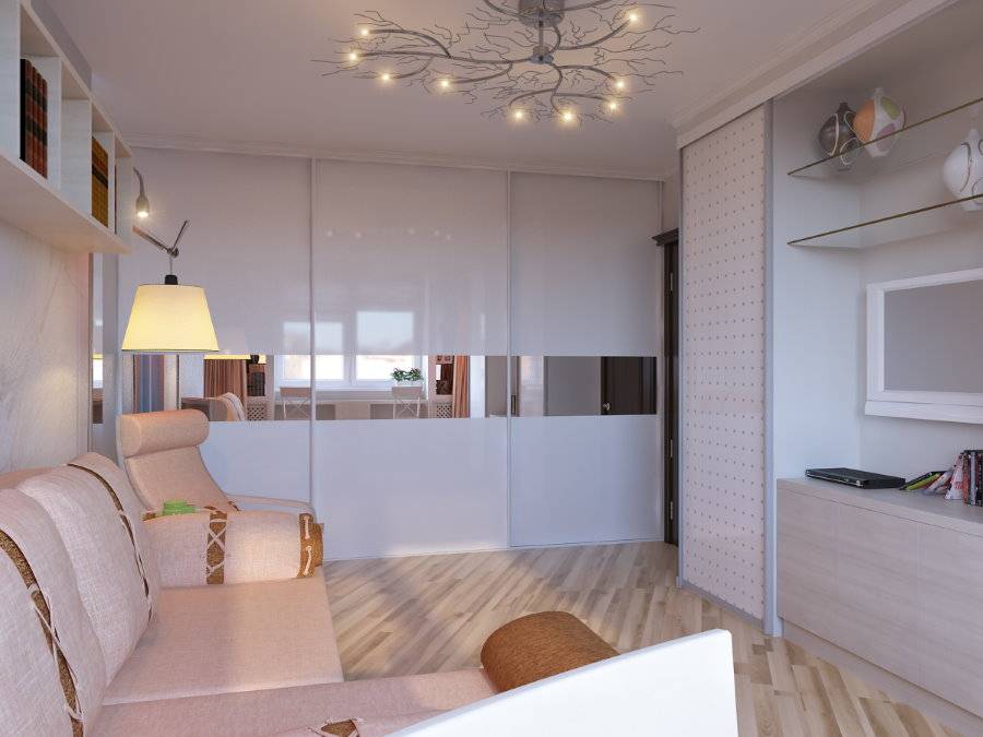 Максимально освободить пространство в комнате позволит размещение гардероба или кладовки в прихожей. Это поможет избежать покупки тумбочек и другой мебели для хранения вещей. Визуально расширить пространство можно с помощью шкафа с зеркальными поверхностями.