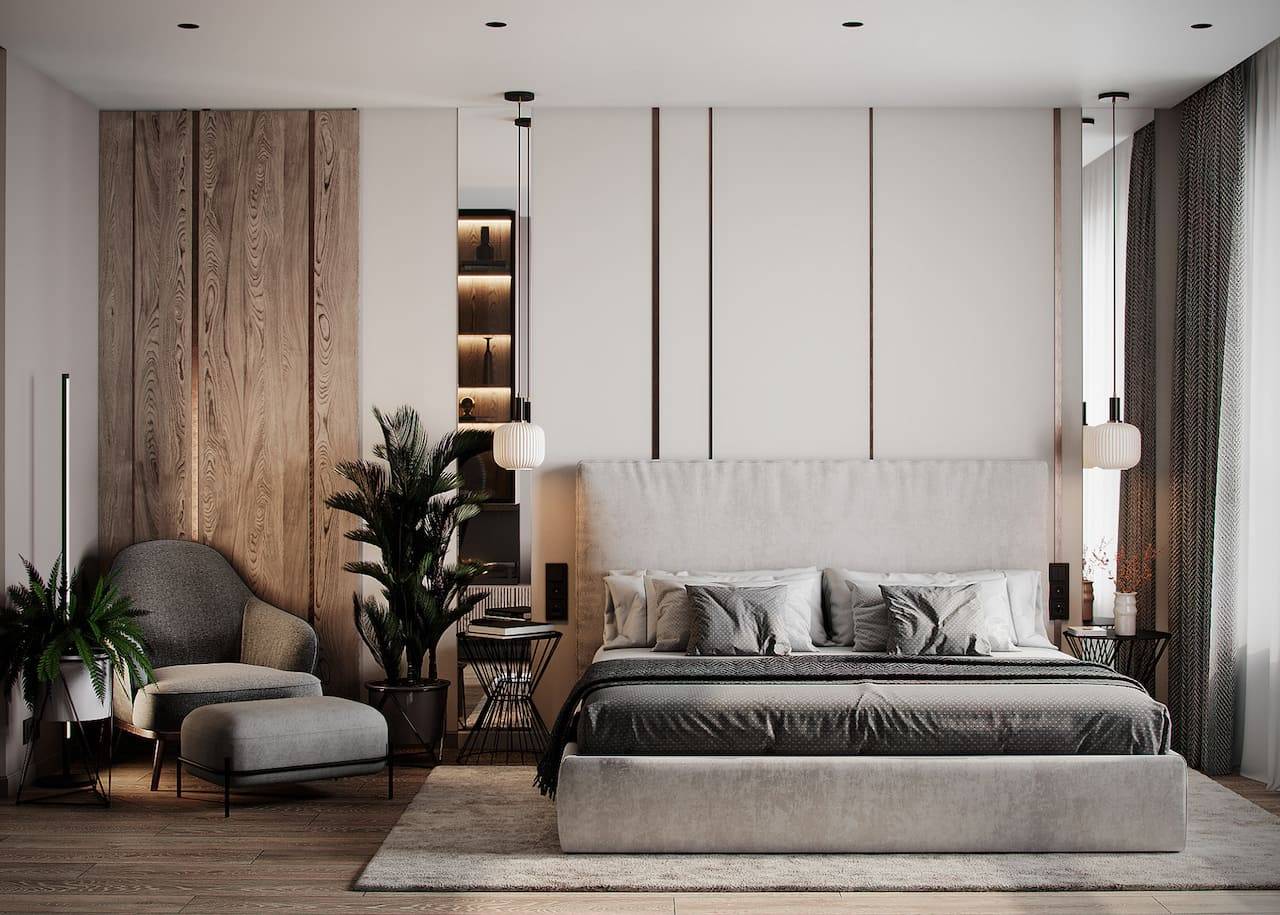 Вагонка из светлой древесины в оформлении спальни частного дома