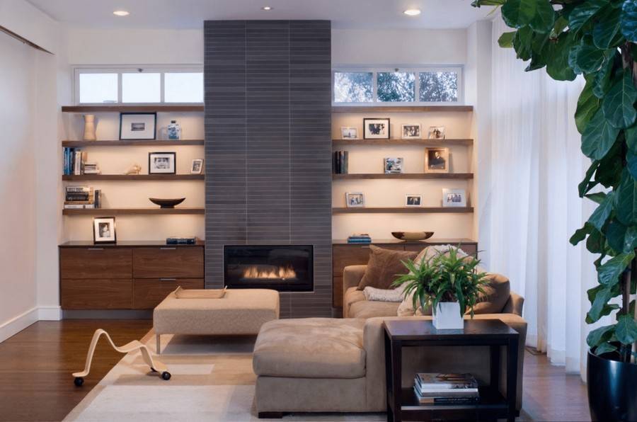 Фото оригинального дизайна стены с камином и телевизором можно увидеть ниже.