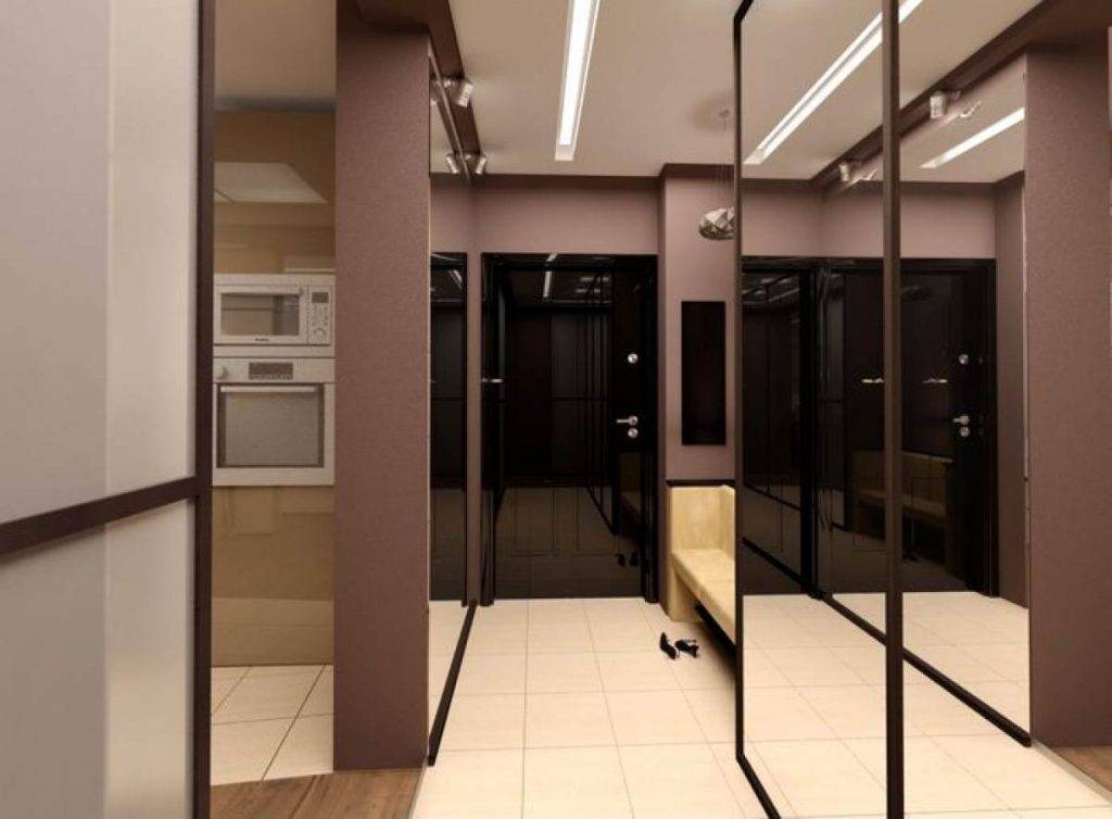 Неглубокий шкаф на всю высоту с зеркальными дверцами визуально расширит узкий коридор. Достаточно 30-40 см глубины, чтобы разместить полки для хранения обуви, одежды, головных уборов и выдвижные штанги для вешалок.