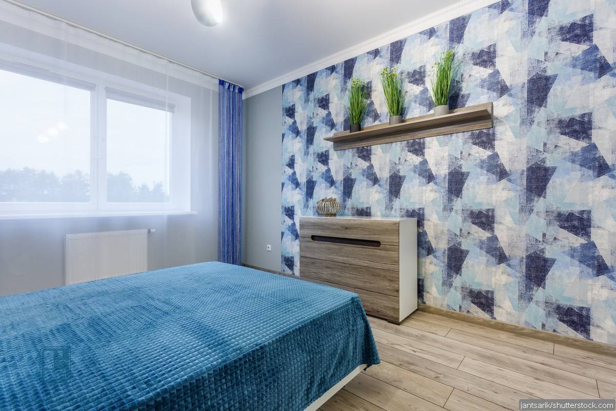 Узкая спальня с акцентом голубыми обоями на стенеИсточник homify.ru