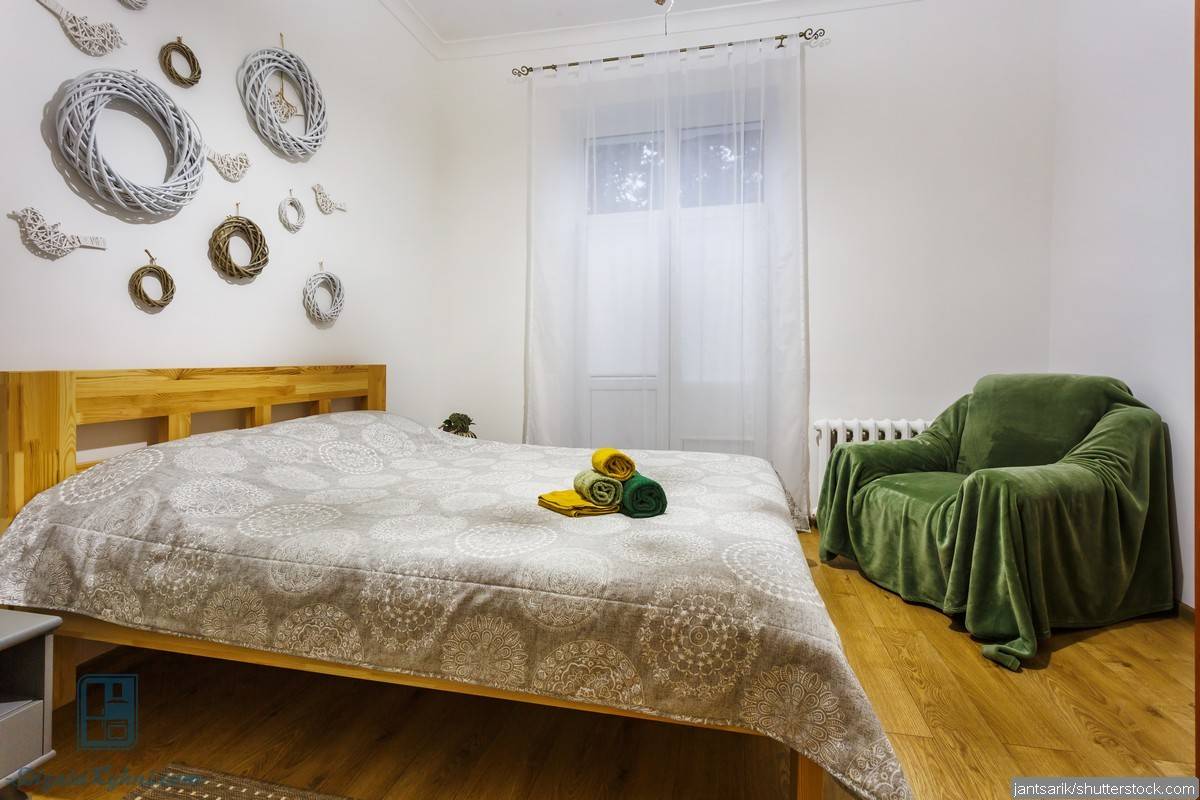 Узкая спальня с салатовыми стенами и зеленым декором на кроватиИсточник dizainexpert.ru