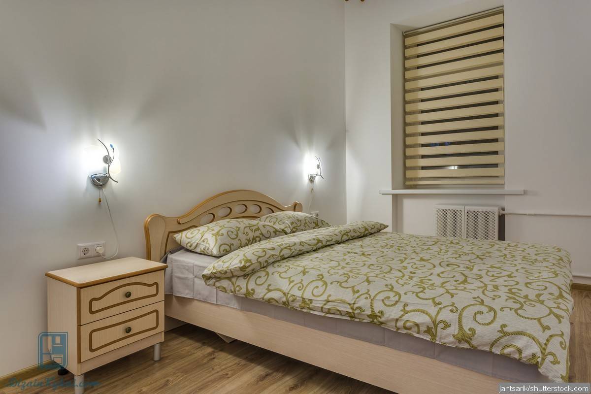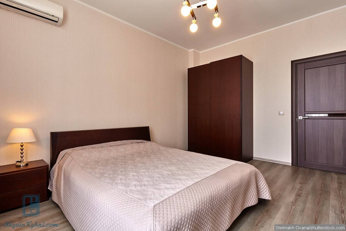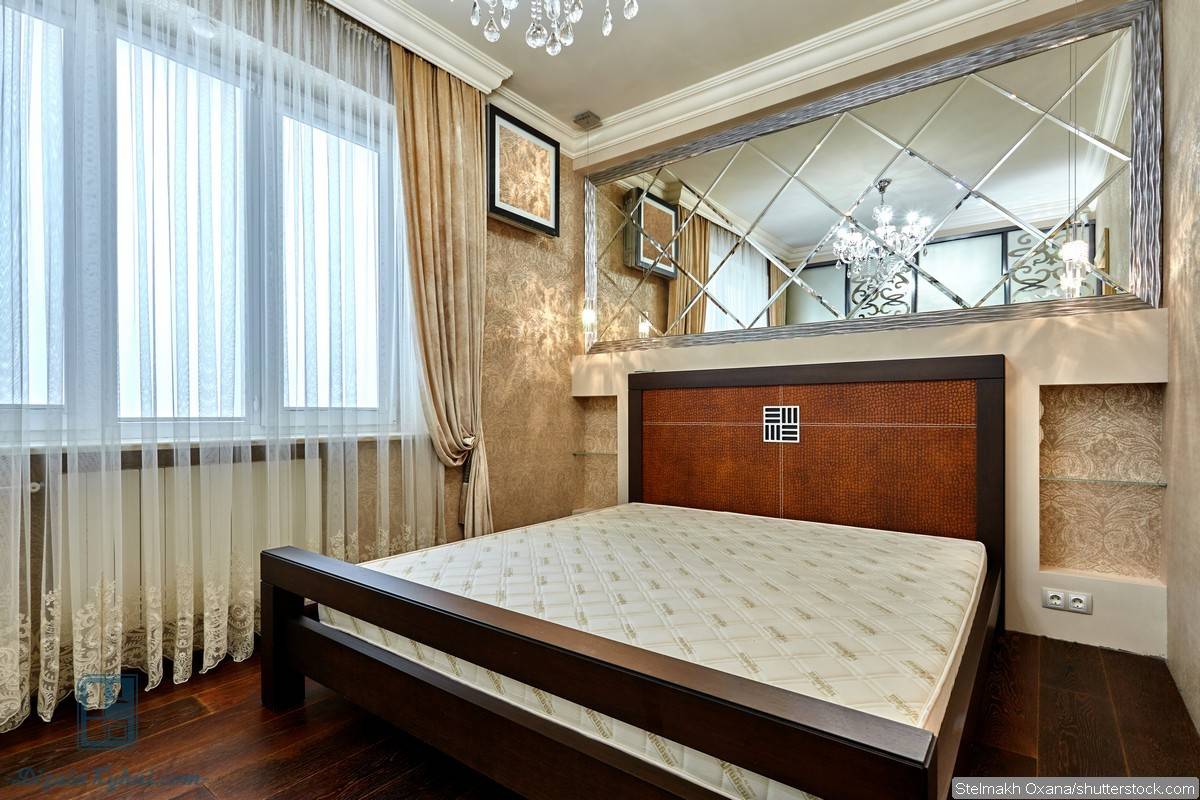 Кровать – основной элемент интерьера. Хорошо, если она будет без высоких ножек или опорных конструкций, на платформе, например. Роскошных изголовий и широких спинок лучше тоже избегать. Желательно выбирать модель со встроенными ящиками.