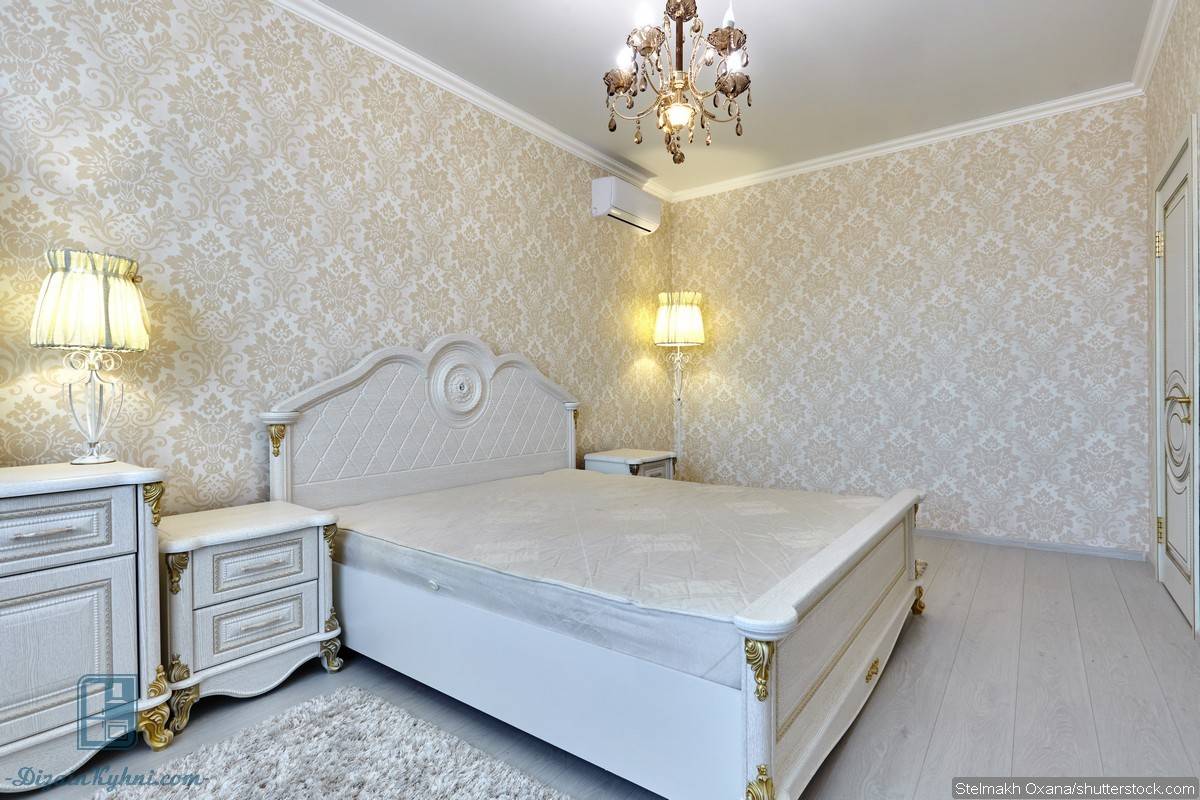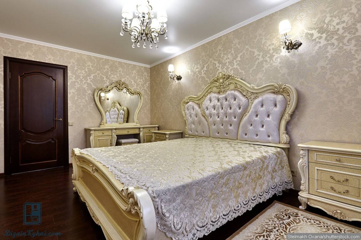 Резная мебель, окрашенная эмалью в тон слоновой кости, создаст величественную атмосферу дворца. Изголовье кровати может быть оббито мягкой кожей. Окна следует закрывать портьерами из парчи, бархата, атласа в тон общего оформления. Такие же ткани подойдут и для балдахина. Покрывало может быть жаккардовым, с мерцающими рисунками. Обилие света в «драгоценном» обрамлении превратят обычную маленькую комнату в поистине королевскую опочивальню.