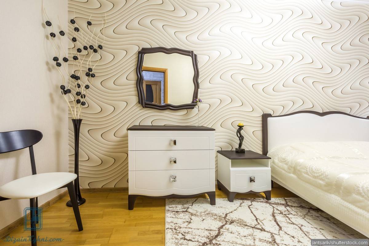 Для современных интерьеров характерно применение естественной палитры цветов: хвойный, коричневый, песочный, горчичный. Чтобы создать четкие границы спальни, можно одну длинную стену окрасить в насыщенный тон, задекорировать ее штукатуркой, жидкими или фотообоями. Последние материалы должны выбираться так, чтобы при наклеивании их создавалось ощущение глубины. Подобную иллюзию создают рисунки лестниц, узких проулков, автомобильный дорог, подъёмов в гору.