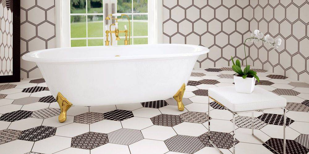 Что касается размеров плитки, то здесь строгих требований нет, хотя использовать слишком крупные элементы не рекомендуется. Оптимальный выбор – прямоугольная плитка 75х150 мм и квадратная 200х200 мм. Использование прямоугольной плитки позволяет зрительно расширить ванную, а комбинирование квадратных и прямоугольных элементов повышает декоративность отделки. Но наибольший эффект дает плитка нестандартной формы, например, в виде пчелиных сот.