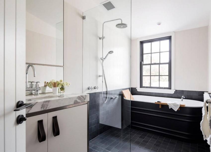 Сочетание белой и серой плитки в ванной
