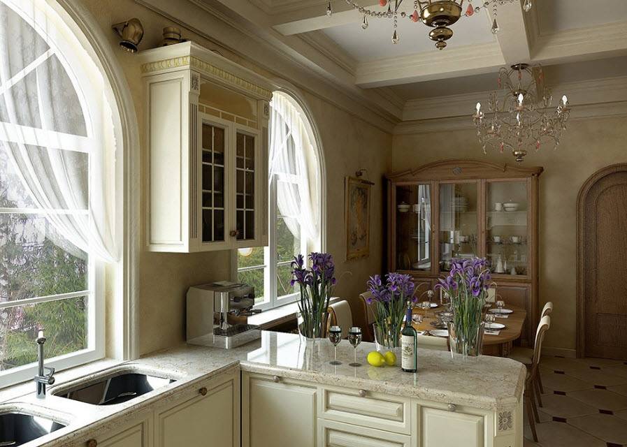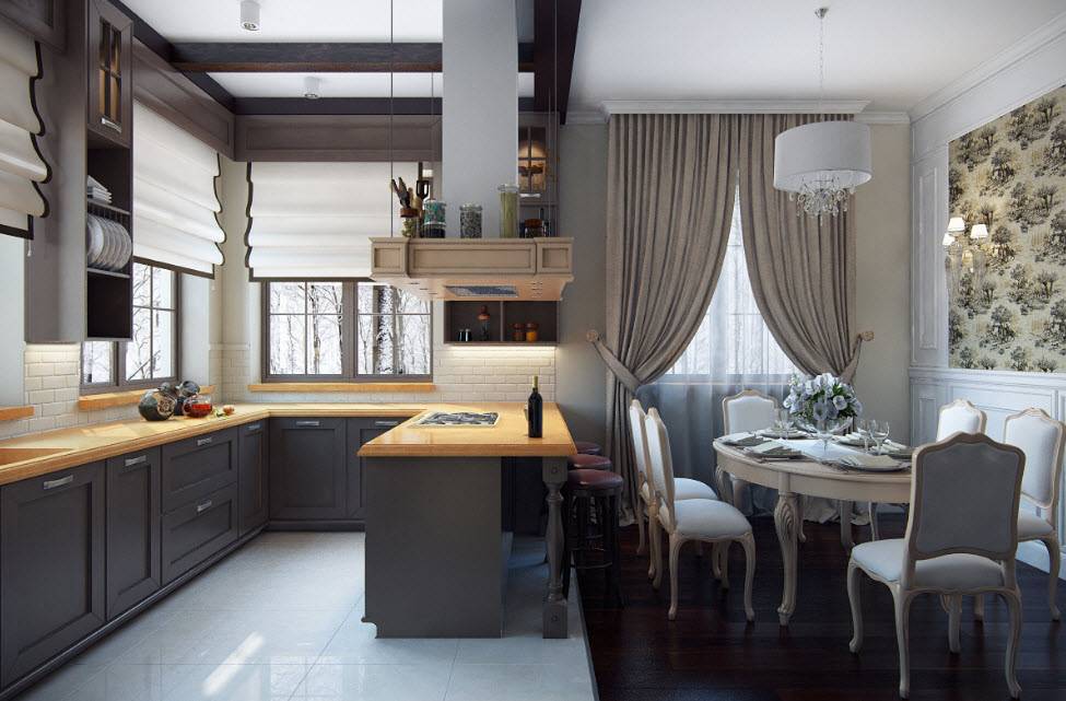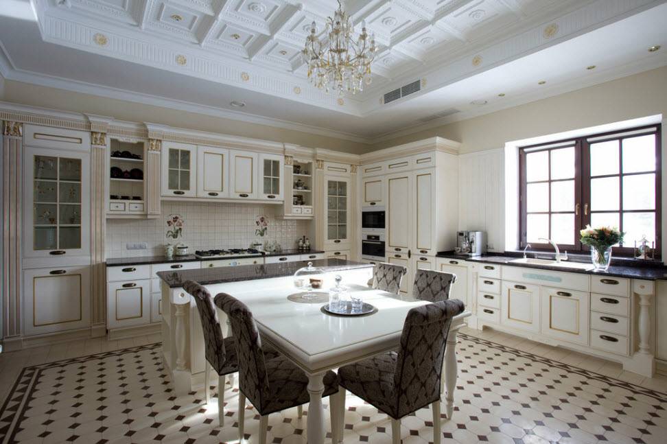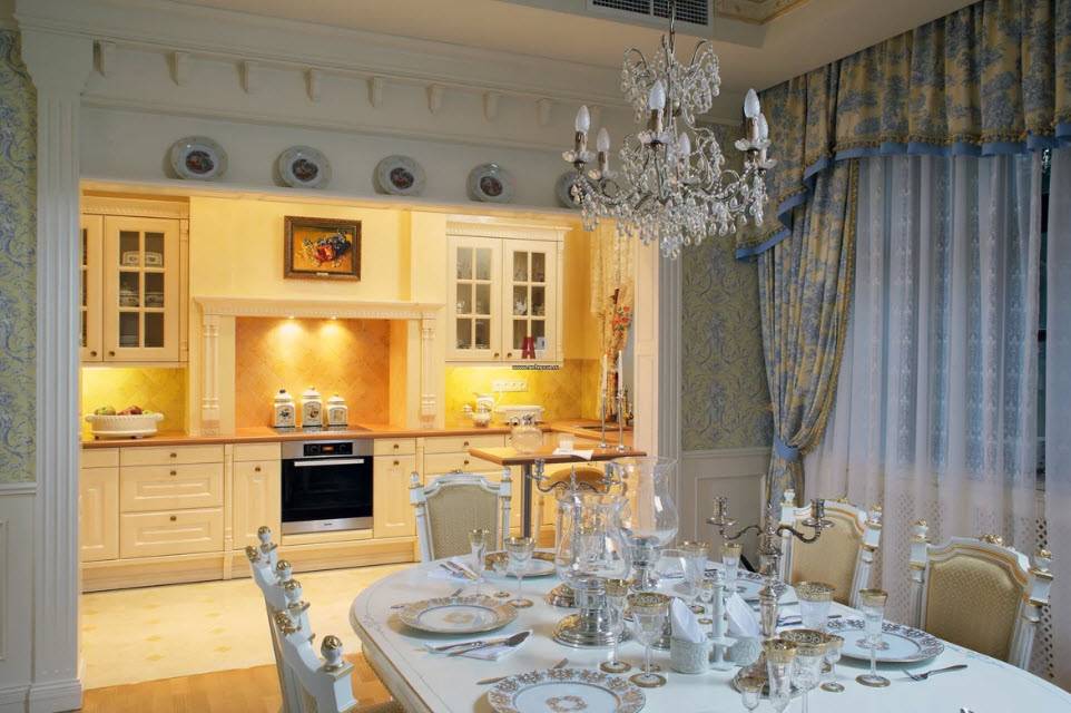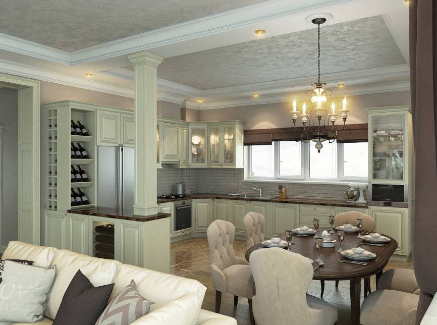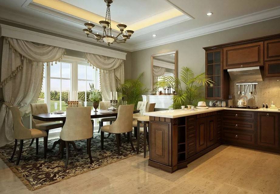 Классическая кухня-гостиная, оформленная по типу классики должна отвечать нескольким требованиям: