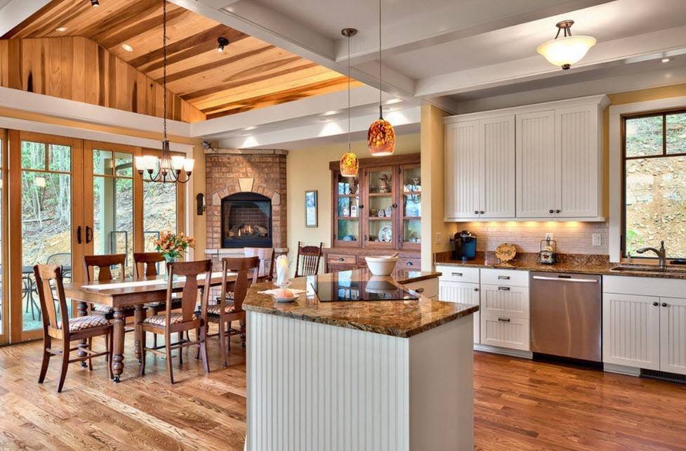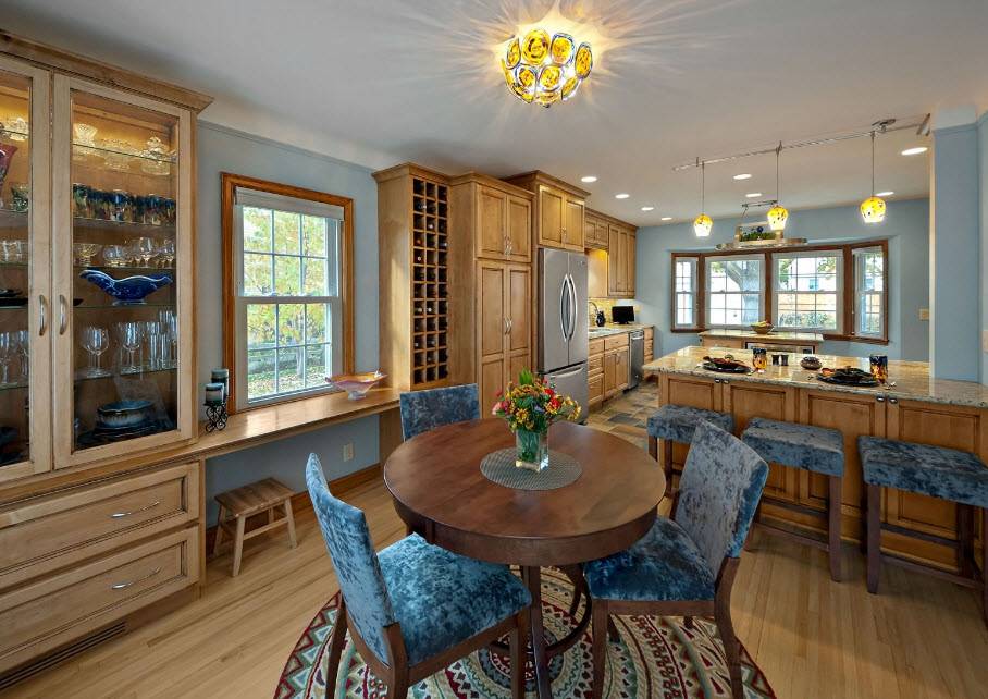 - Обеденное место, располагающееся у подоконника, уже обладает естественным источником света. Однако дополнить его придется за счет люстры, располагающейся над обеденным столом или формирования второго уровня потолка. Здесь получится вмонтировать ряд точечных светильников.