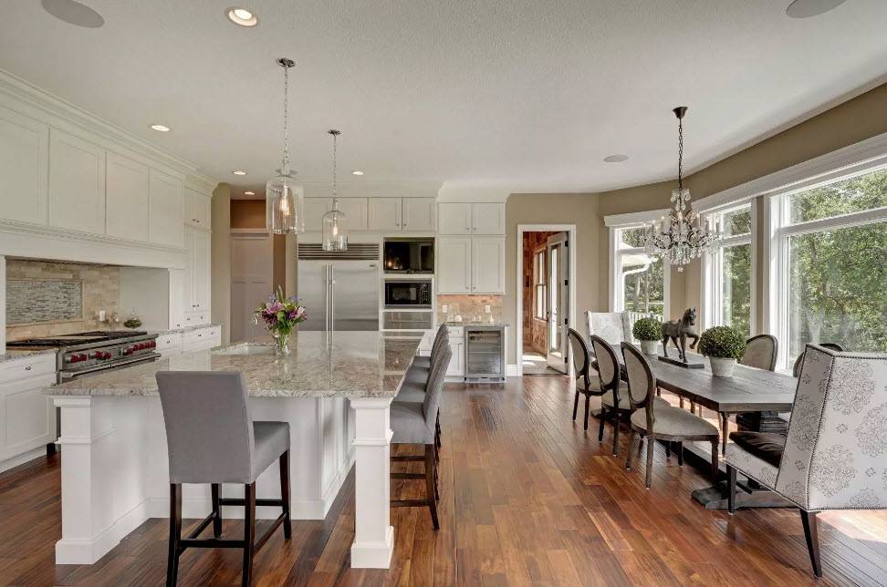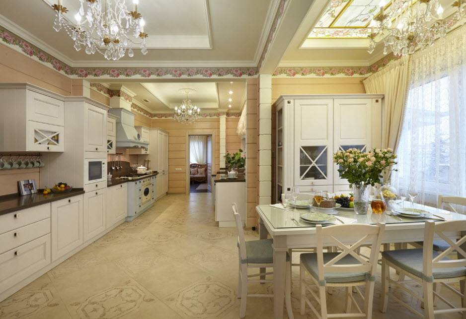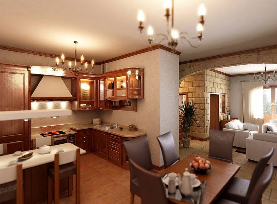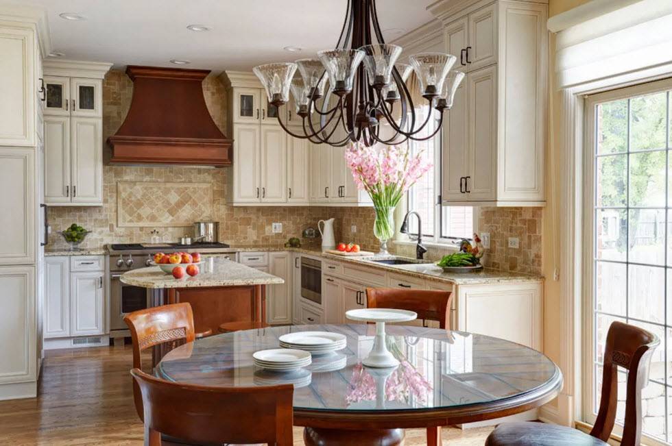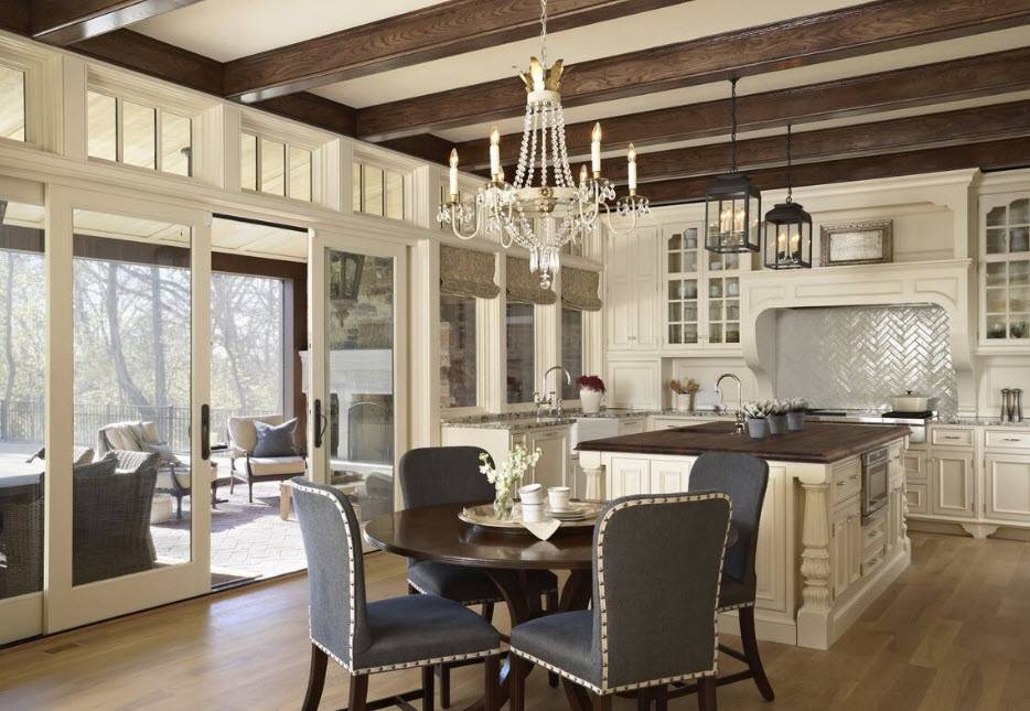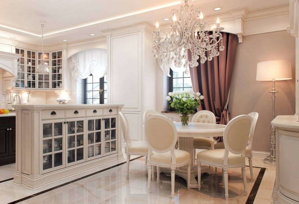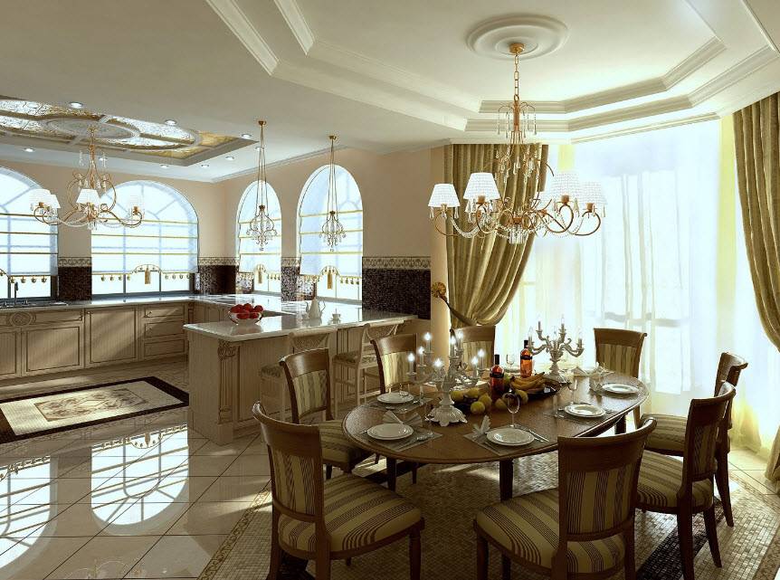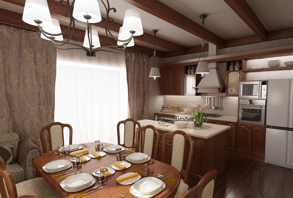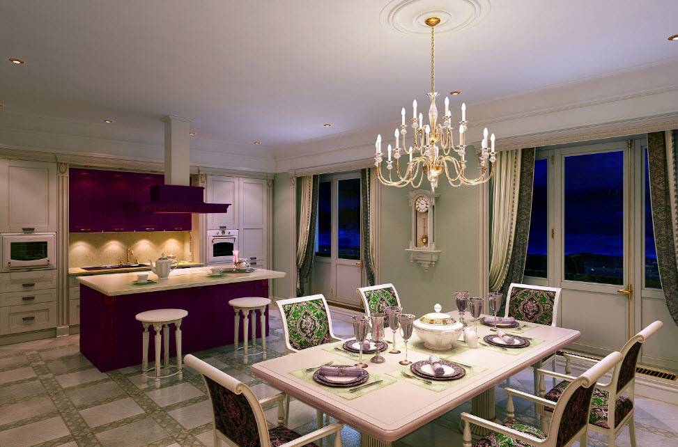 Люстра является обязательным элементом для классического стиля оформления кухни-столовой