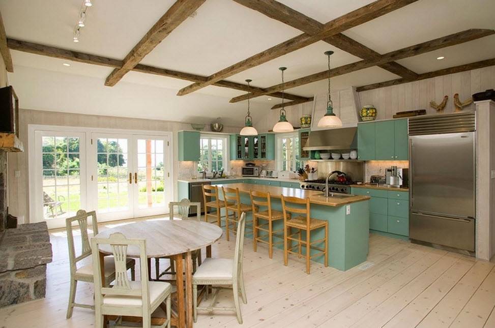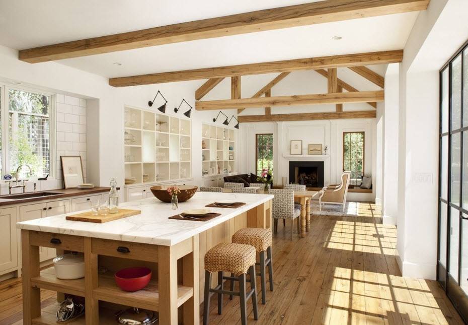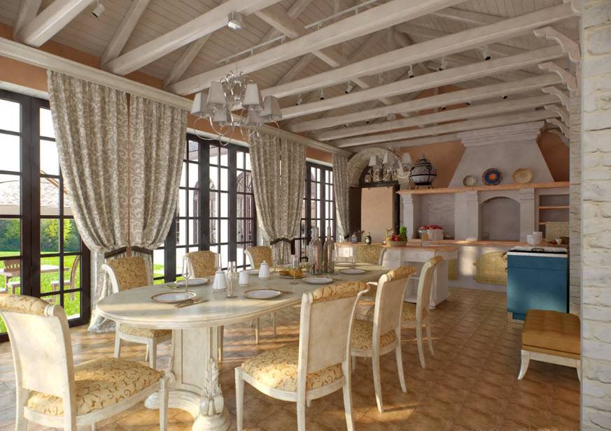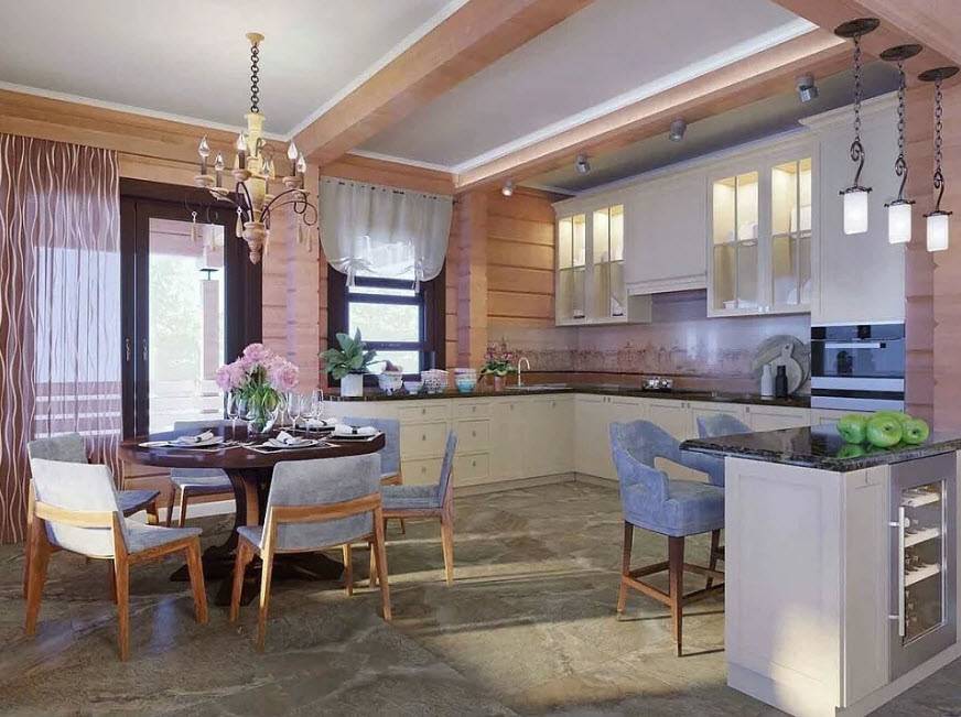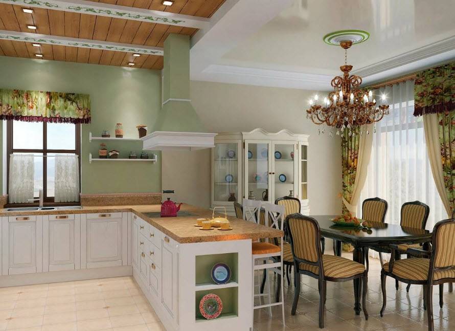 Очень интересен дизайн для кухни-гостиной в стиле «прованс». «Французская» кухня — гостиная — это очень уютное место, от которого веет теплом и заботой. Интерьер в этом стиле предполагает наличие нежных пастельных цветов: горчичный, персиковый, лиловый, бежевый.
