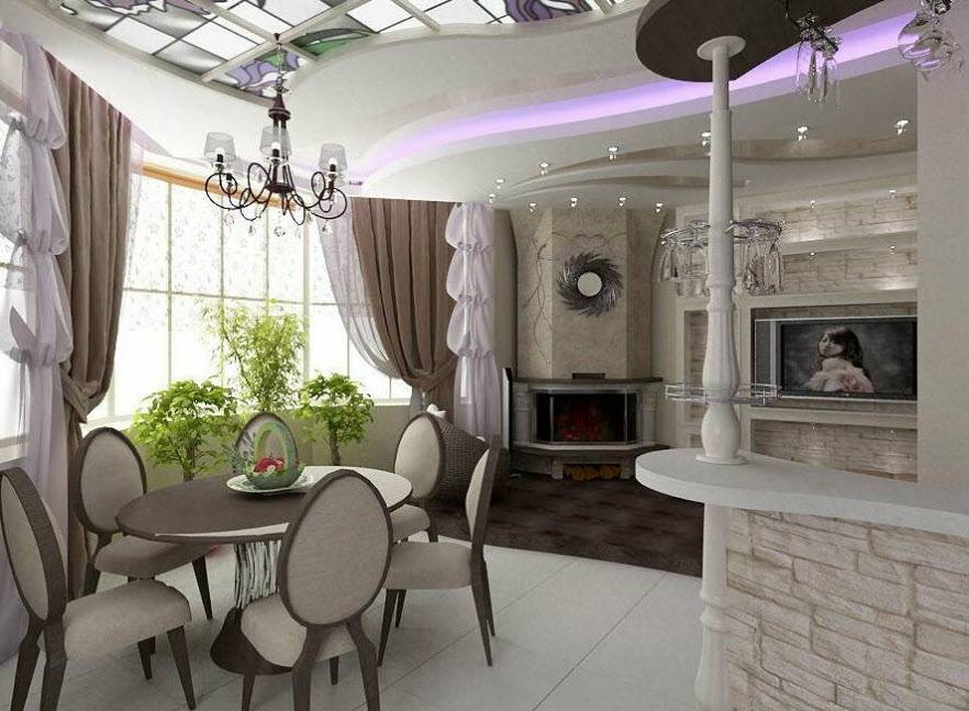 - Если потолок достаточно высокий, можно разделить пространство при помощи разноуровневого потолка (реже пола).