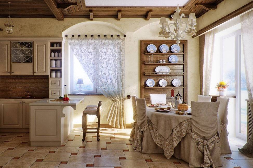 «Прованс — это исключительно натуральные материалы, как для отделки, так и для мебели. Грубая штукатурка, деревянная мебель и пол, каменные столешницы, текстильные салфетки и скатерти — вот основа уютной кухни-гостиной.