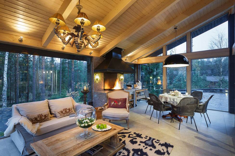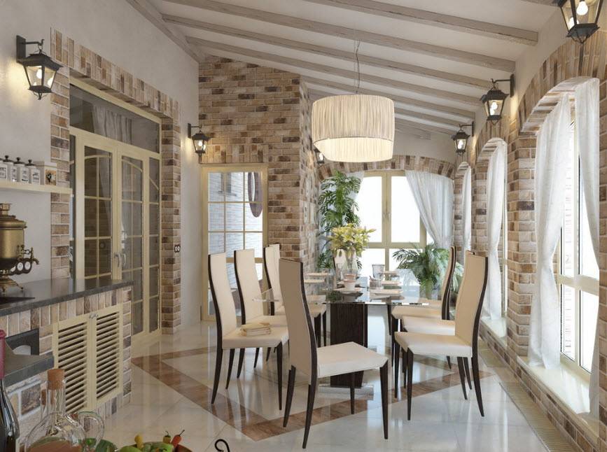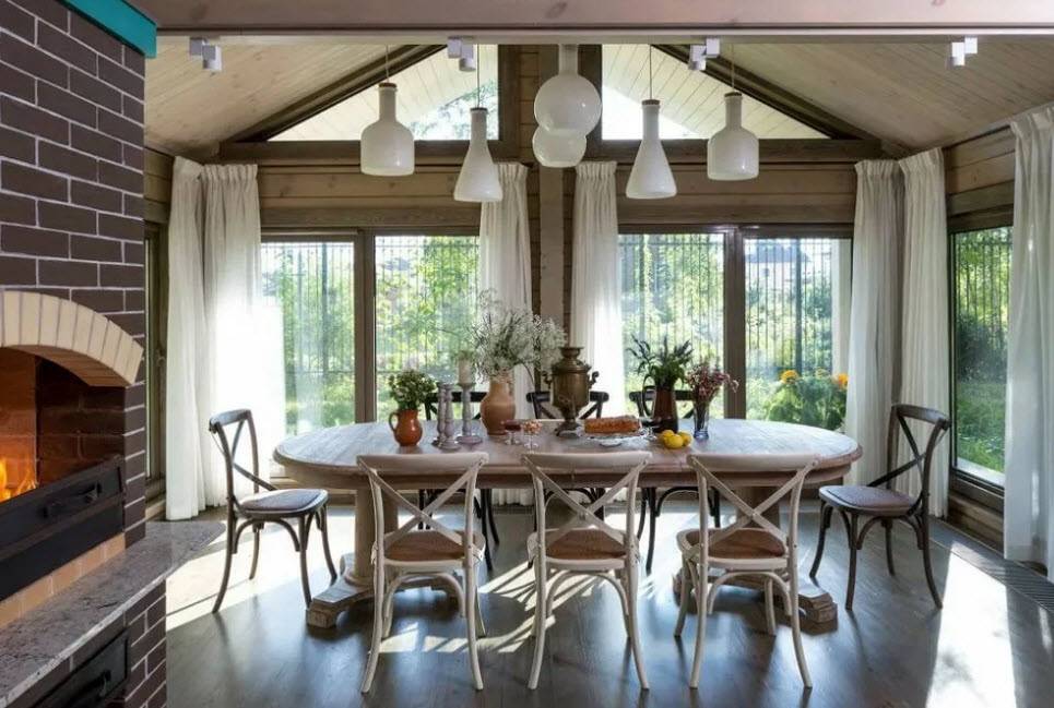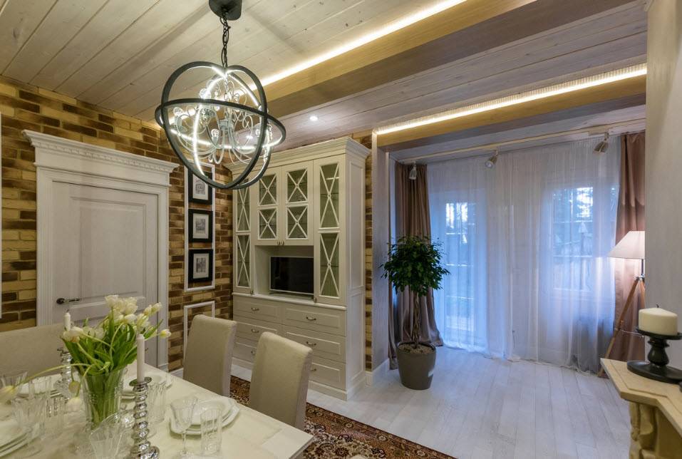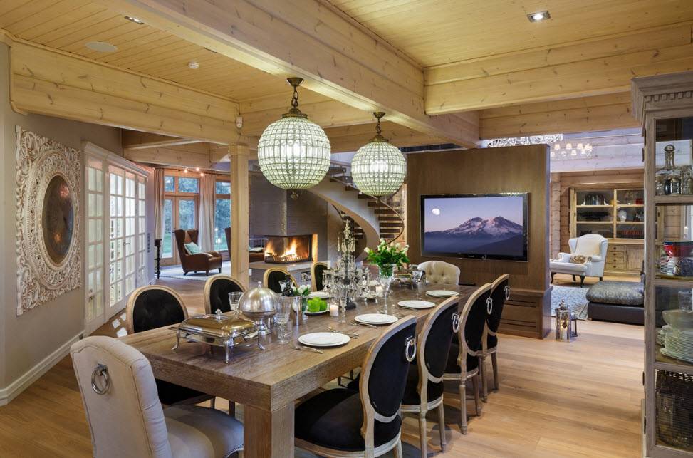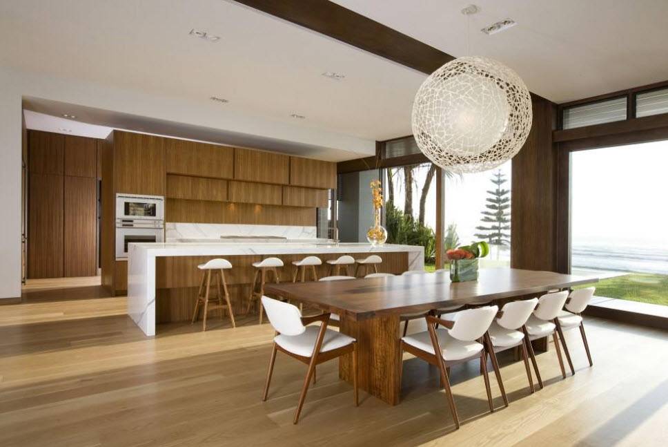 В столовой частного дома важно, чтобы здесь всегда было как можно больше света, желательно разнопланового. Здесь легко сочетаются между собой следующие источники света: