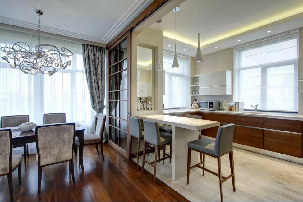 Современная гостиная с кухней не должна быть полностью открытой. Обычно границу устанавливает кухонный остров, барная стойка, шкафы, стол со стульями, а часто диван. Если вы хотите, чтобы граница между кухней и зоной отдыха была более четкой, то можете ввести раздвижные двери, которые могут заменить стену, разделяя кухню и гостиную. Полупрозрачные стеклянные двери позволят адекватно осветить совместную комнату.
