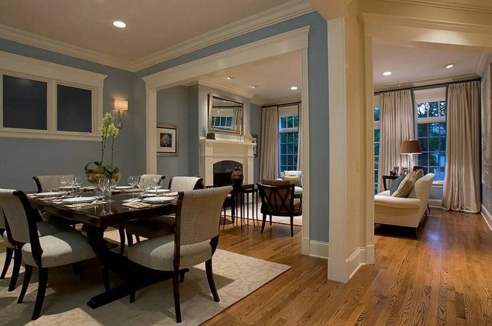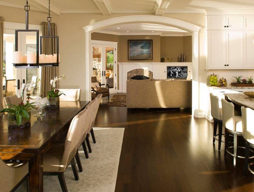 Хозяевам, принимающим решение о совмещении гостиной и столовой, следует позаботиться не только о красоте, но и о комфорте и многофункциональности нового пространства. Первое, о чем необходимо подумать — как грамотно разделить место отдыха и приема пищи. Иногда архитектурные особенности помещения предоставляют оптимальный способ разделения зон.